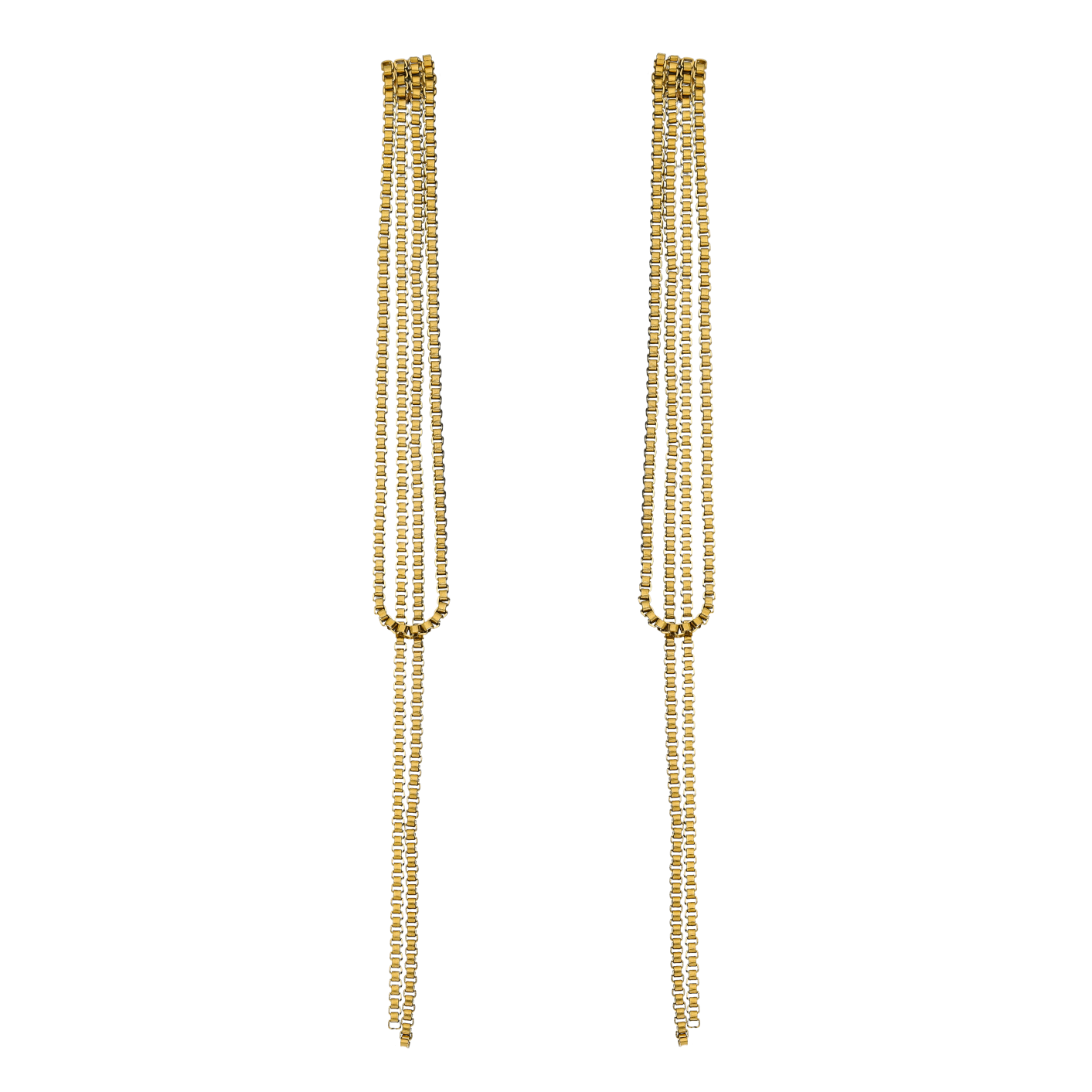 Aretes largos de cadenas finas con caída ligera y elegante. Su diseño en doble línea crea movimiento y un efecto estilizado.