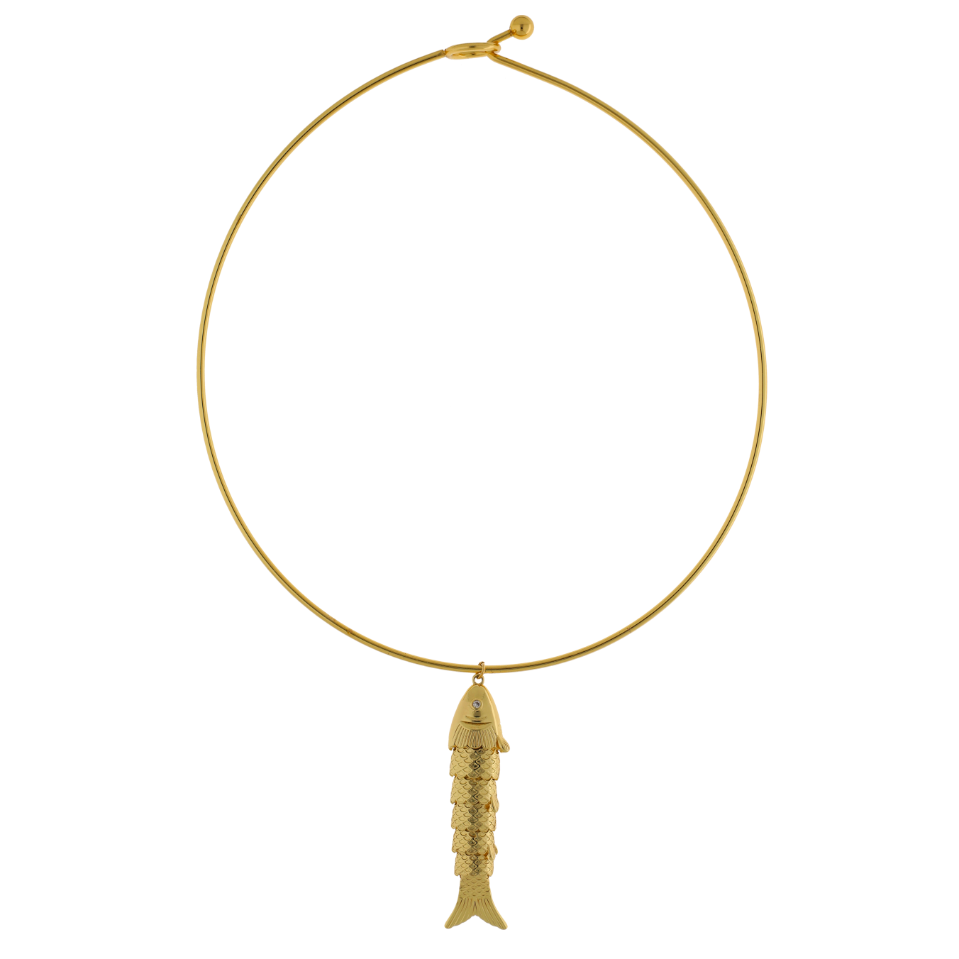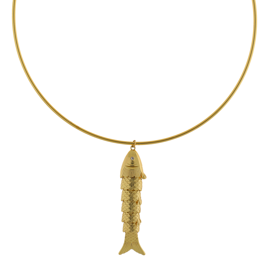 Collar rígido dorado con diseño minimalista y dije central en forma de pez.