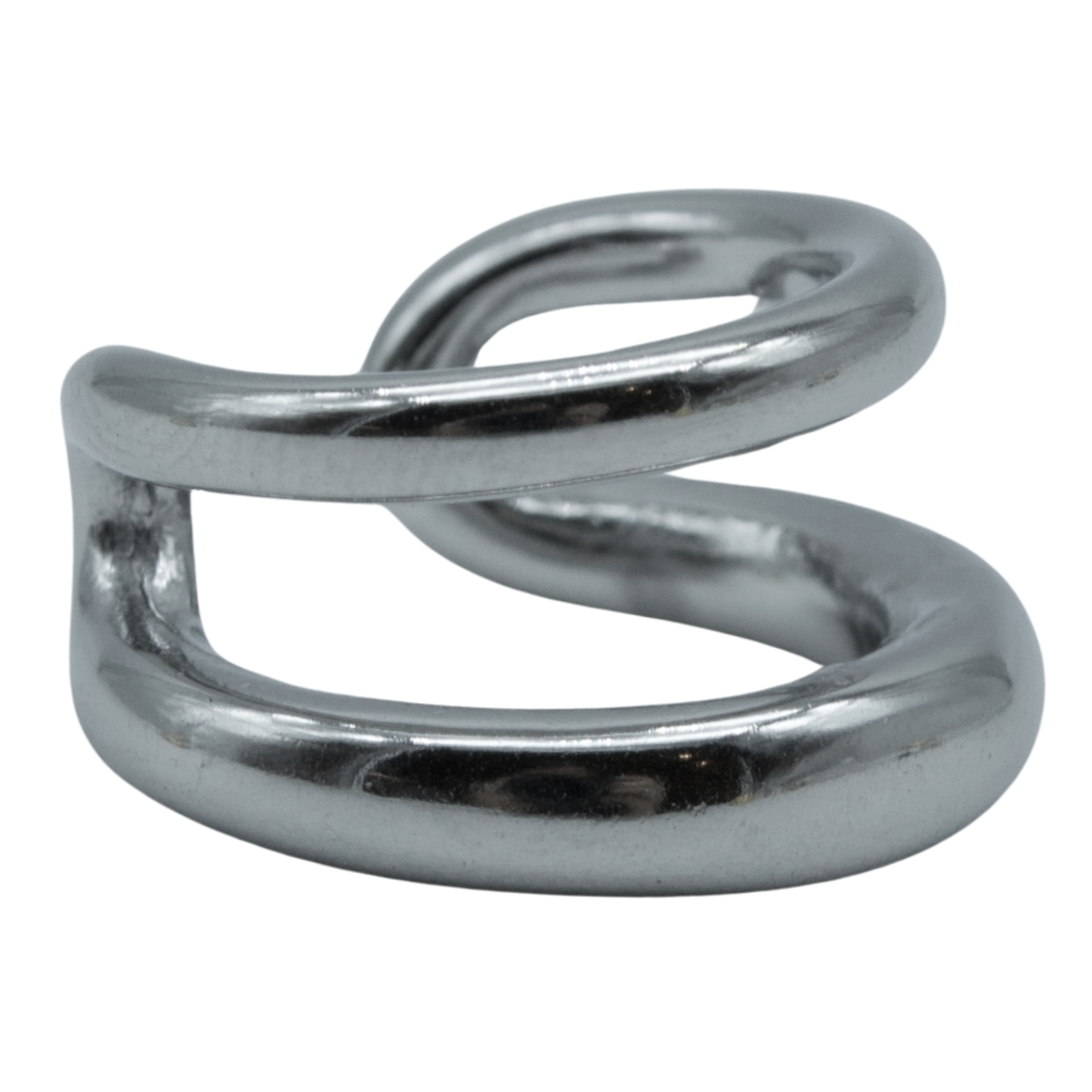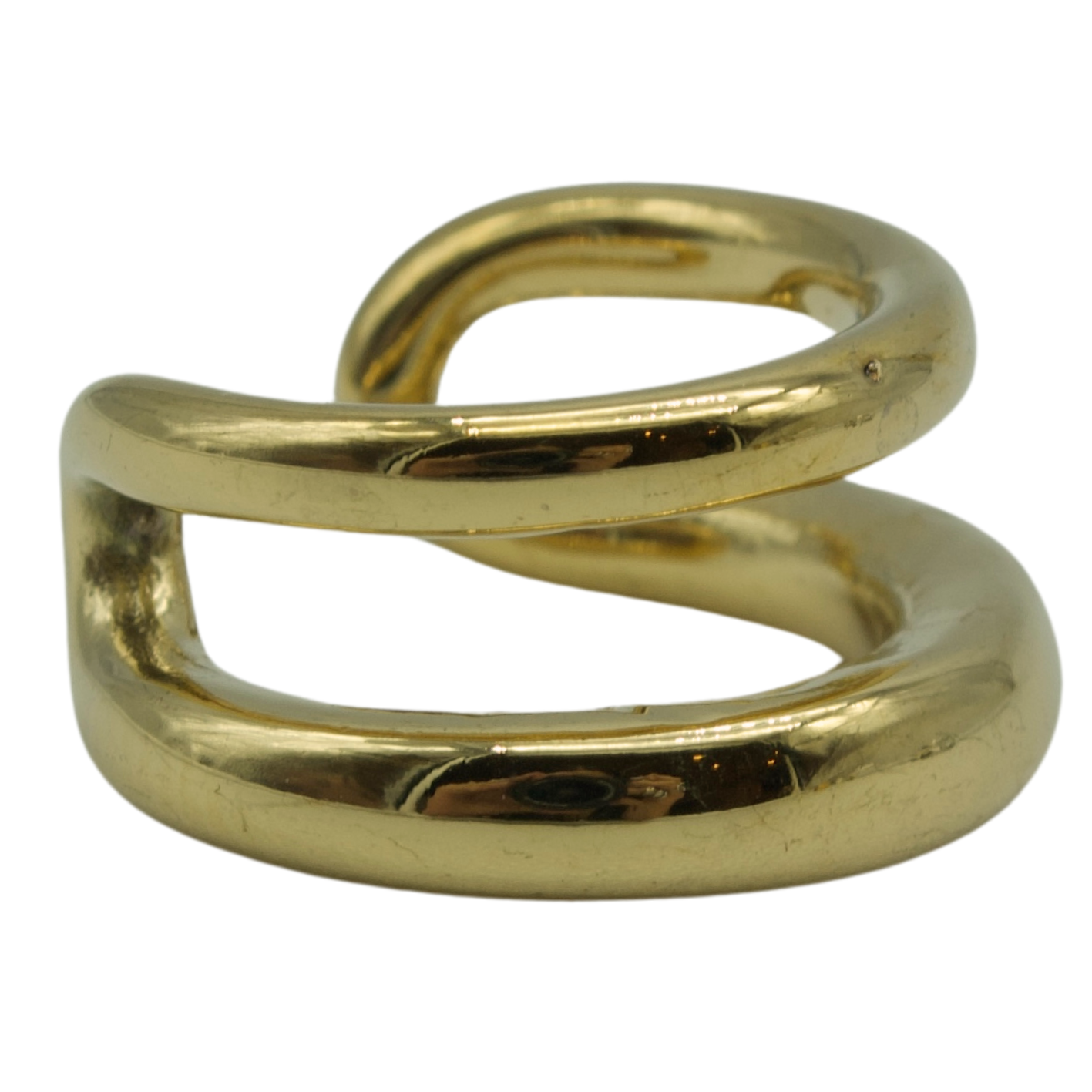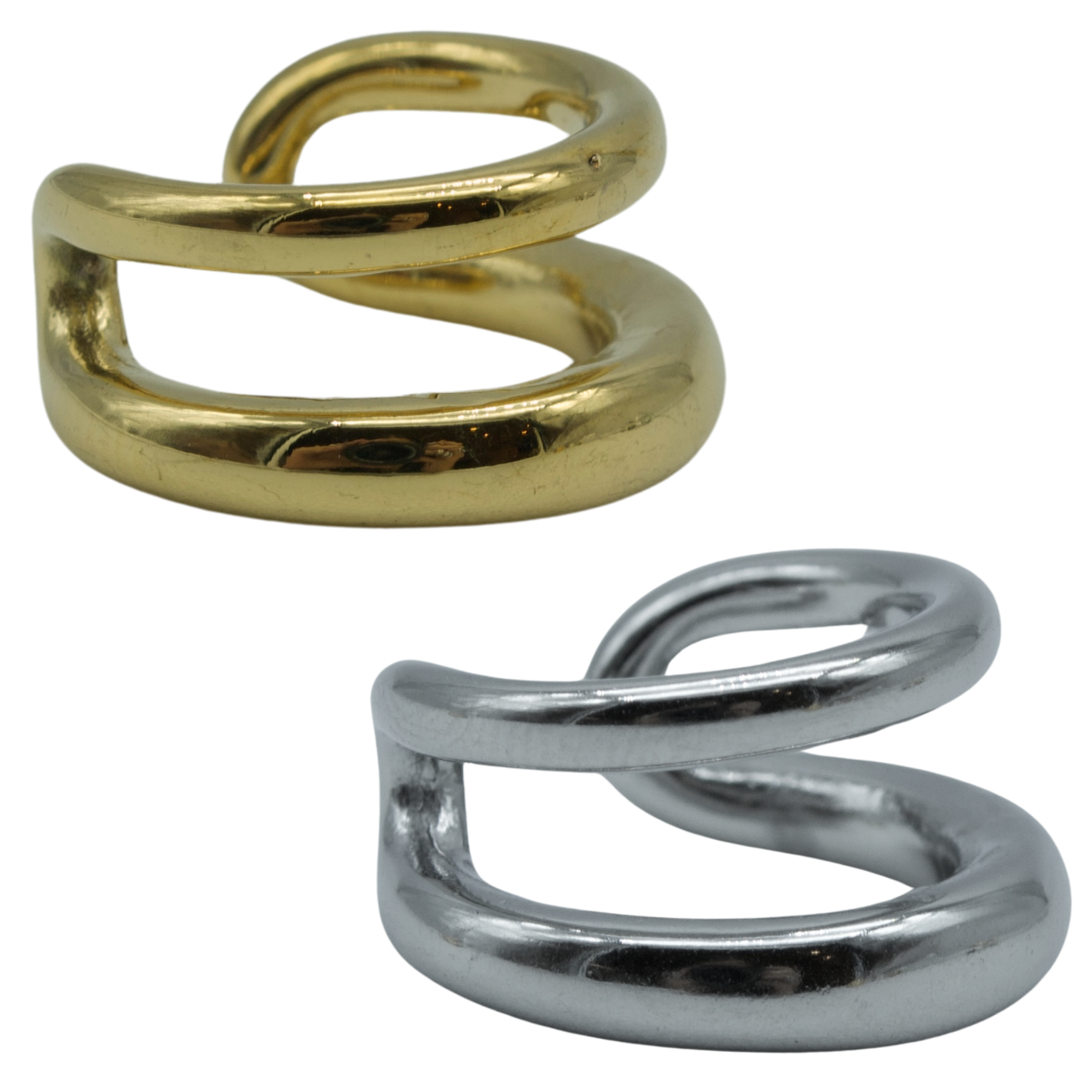 This open-design ear cuff features two thick, parallel hoops that intertwine, creating a double-hoop effect in a single piece. Requiring no piercing, it offers a contemporary and versatile look.