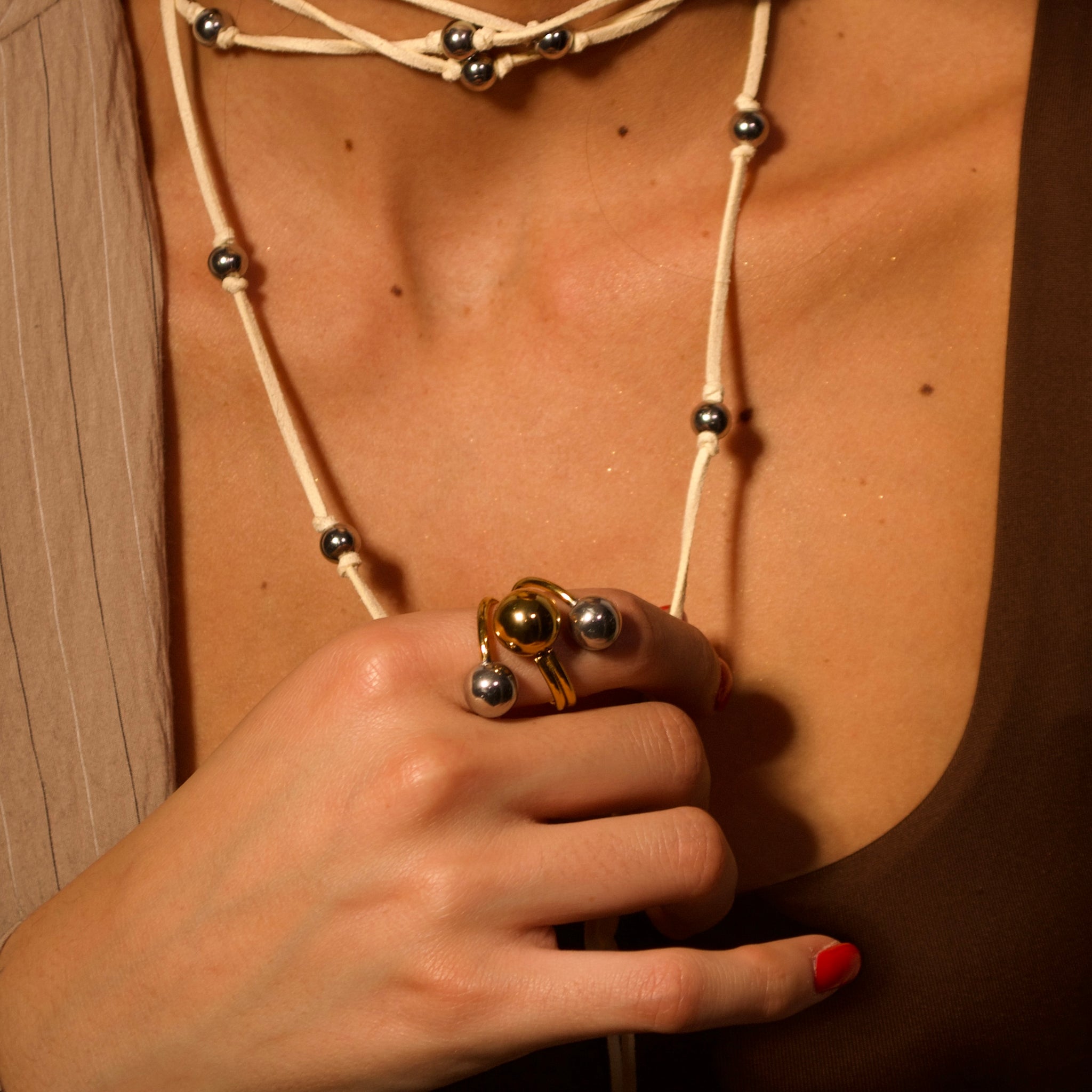 Anillo con diseño envolvente y tres esferas que crean un equilibrio visual entre volumen y ligereza. Su forma abierta permite que sea ajustable el anillo