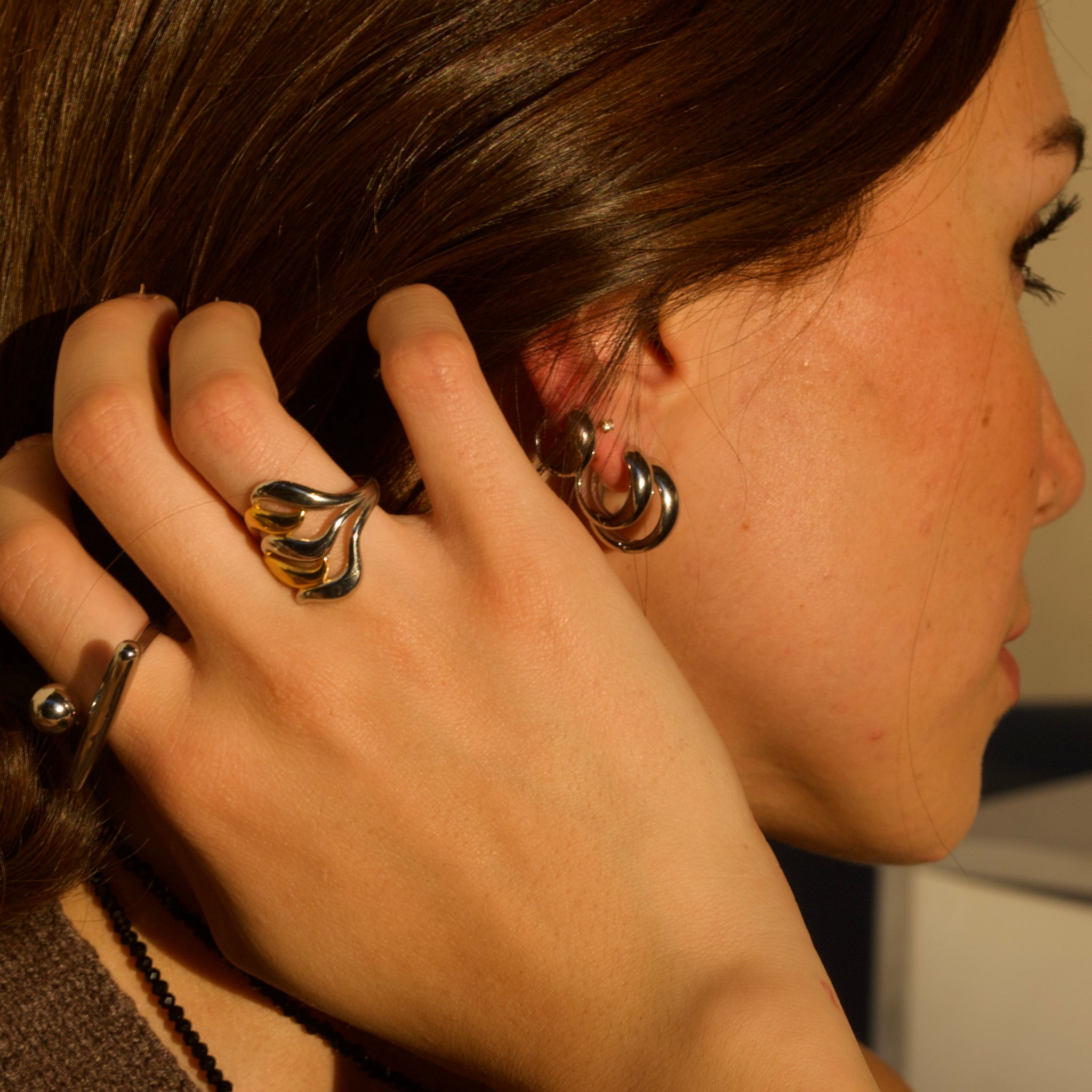 Anillo asimétrico que entrelaza el dorado y plateado