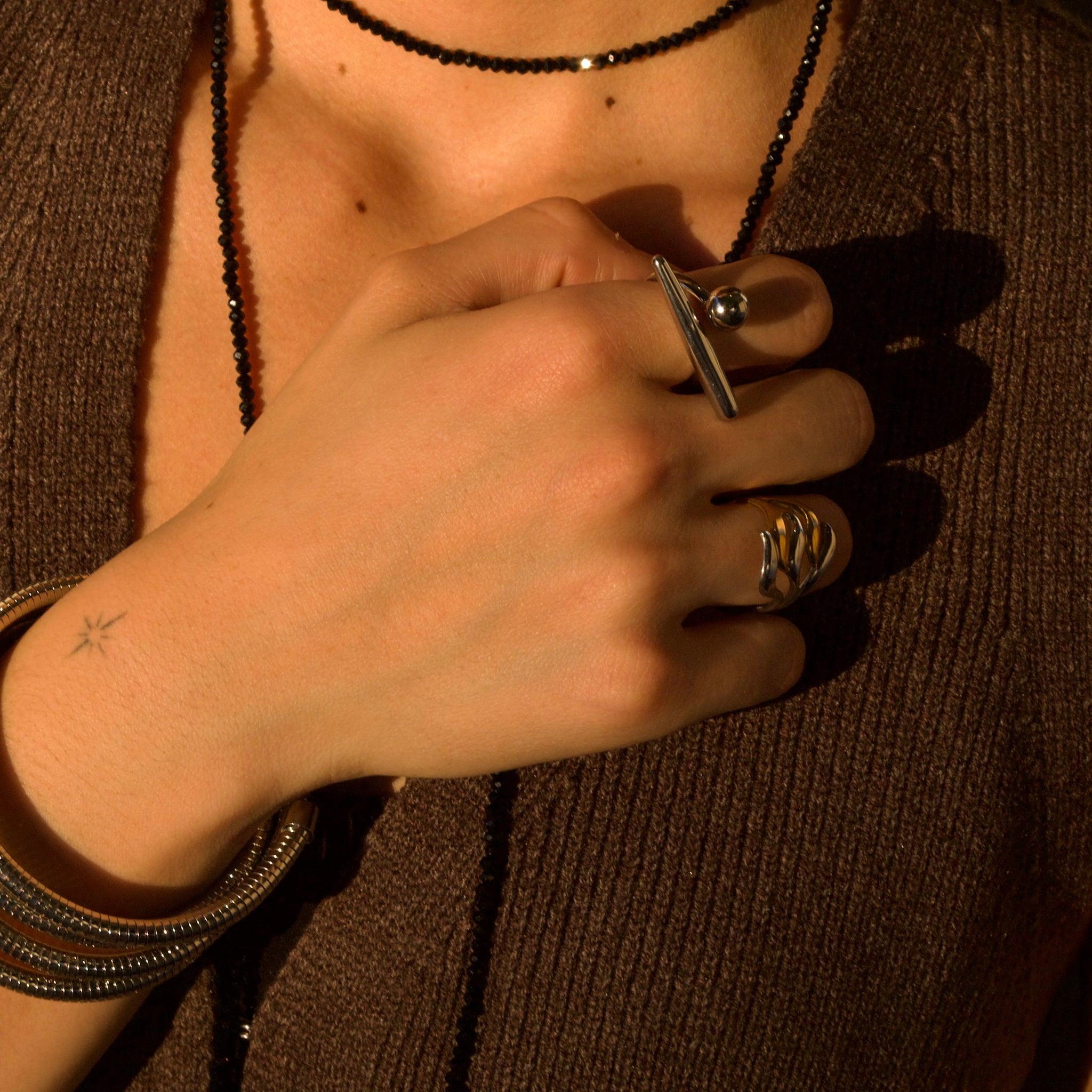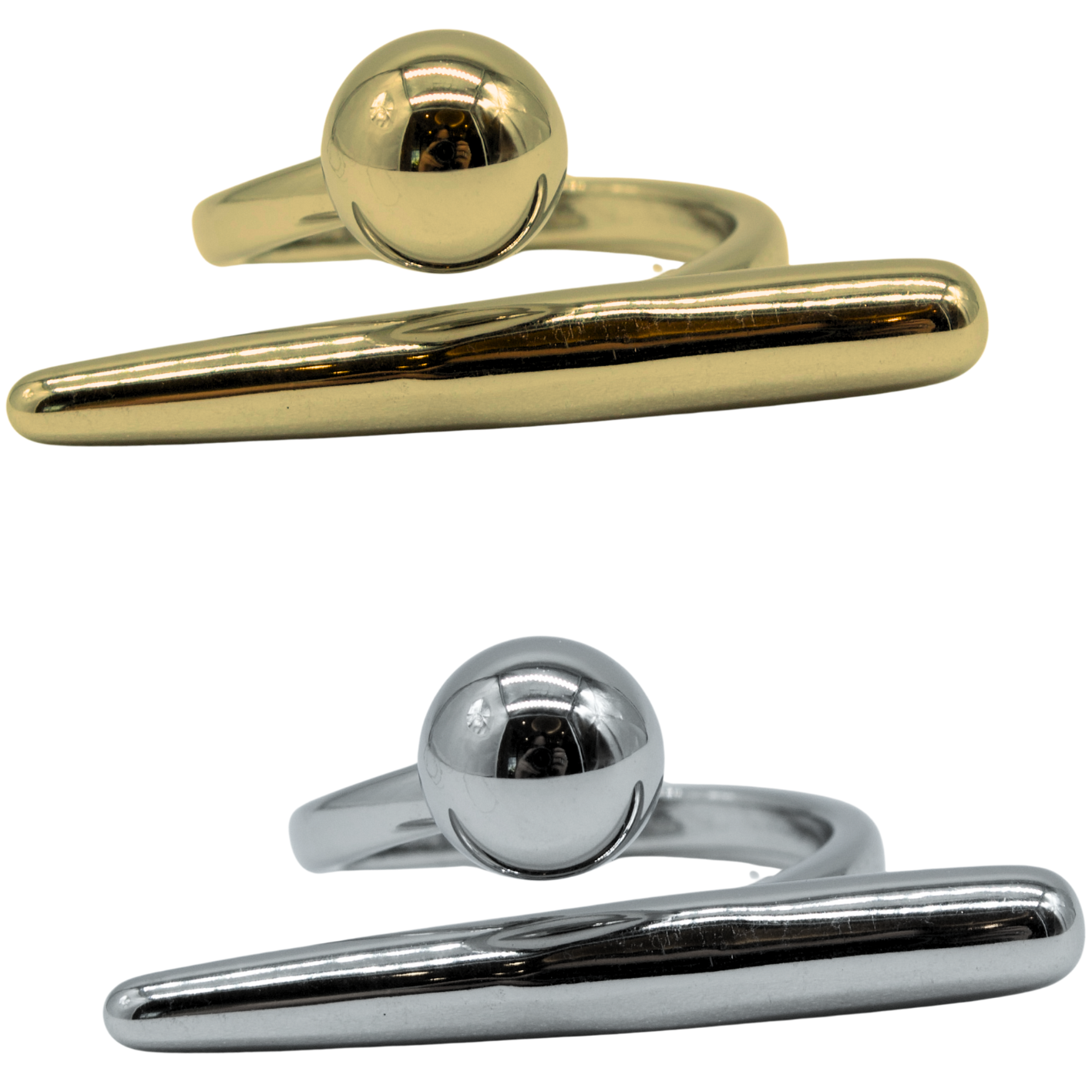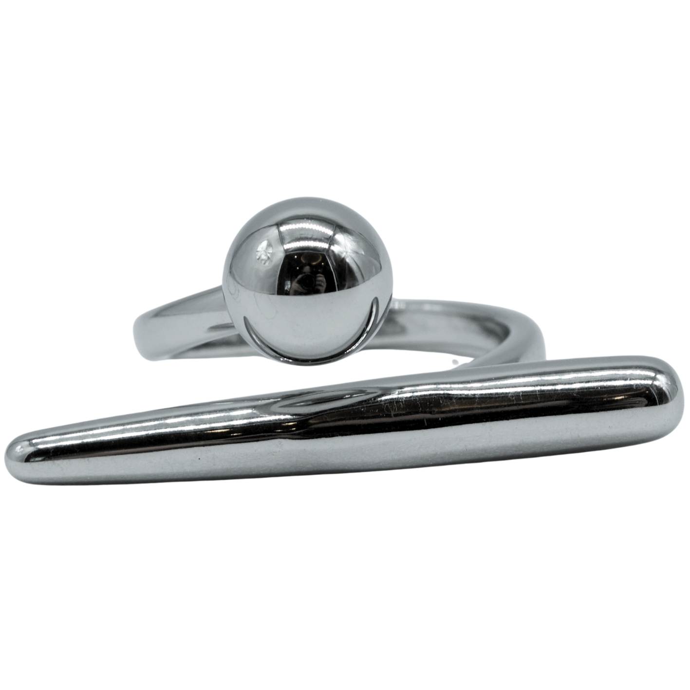 Anillo con estructura abierta con una esfera en un extremo y una barra alargada en el otro