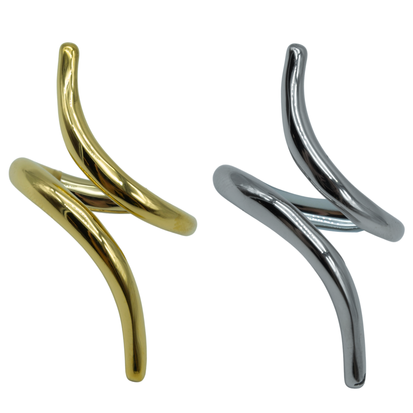 Anillo formado por dos líneas curvas que se cruzan en forma asimétrica, creando un efecto visual elegante