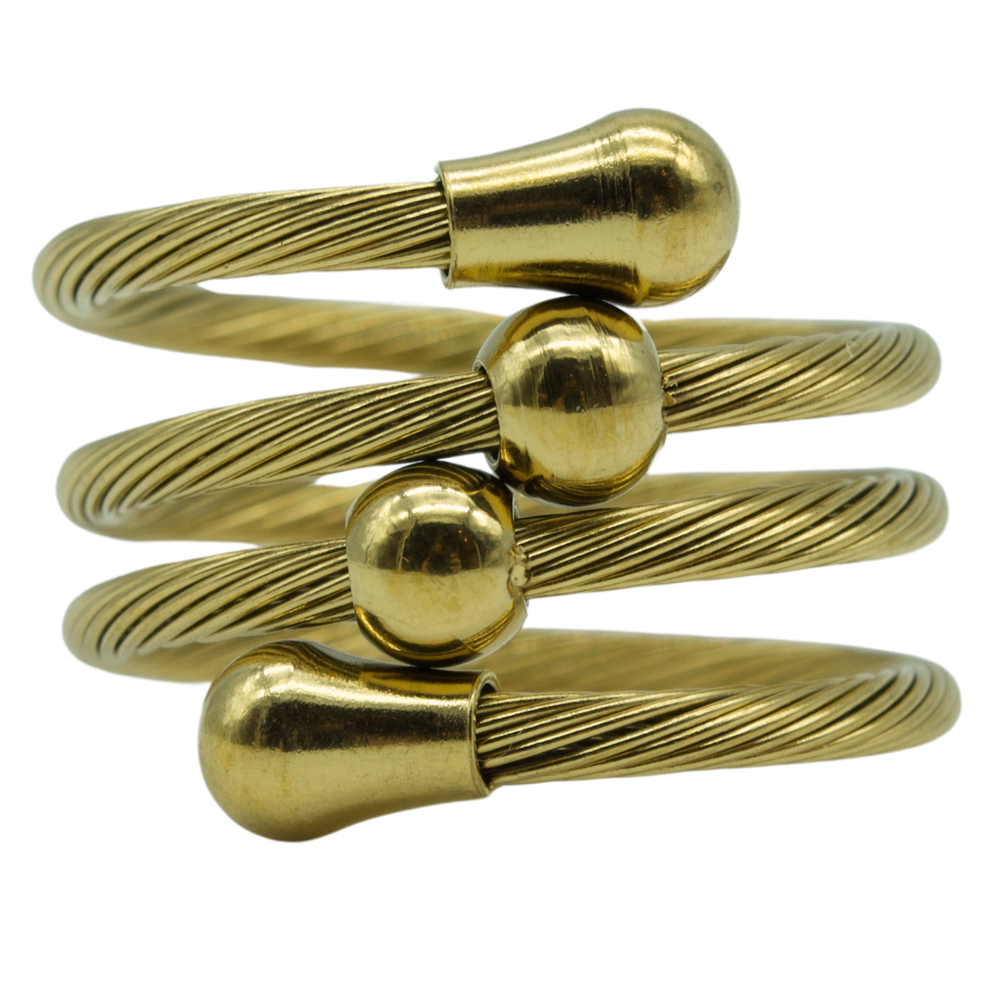 Anillo con tres vueltas de cable metálico con terminaciones en forma de gota y dos esferas en medio decorativas