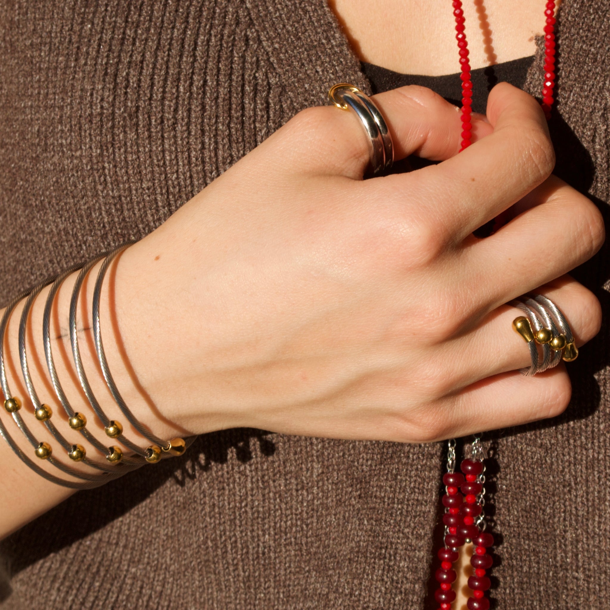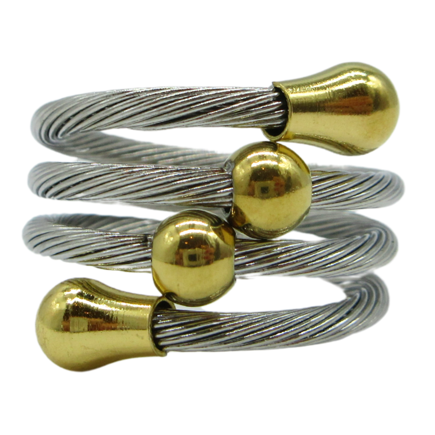 Anillo con tres vueltas de cable metálico con terminaciones en forma de gota y dos esferas en medio decorativas