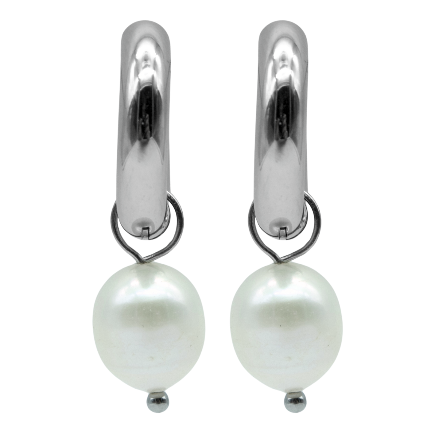 Aretes clásicos, donde la argolla pequeña y gruesa se combina con la caída delicada de la perla blanca
