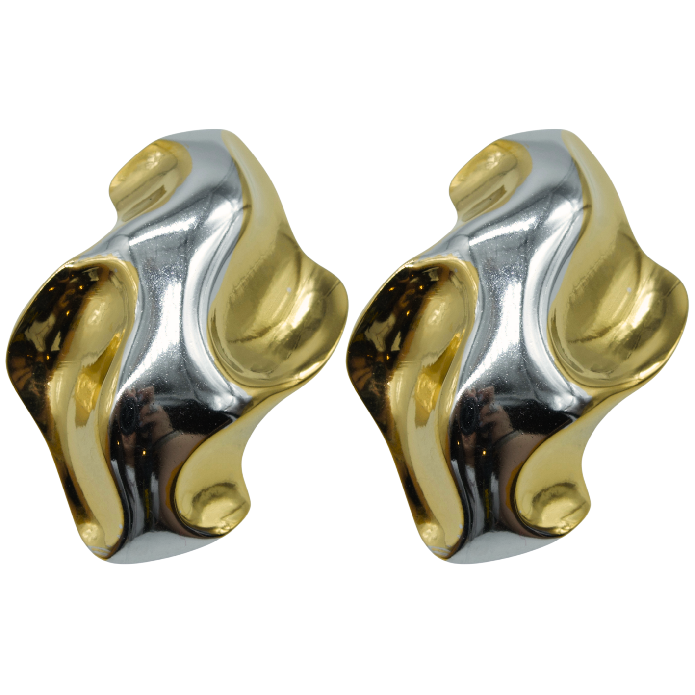 Aretes con acabado dorado y plateado, con un diseño ondulado de líneas fluidas