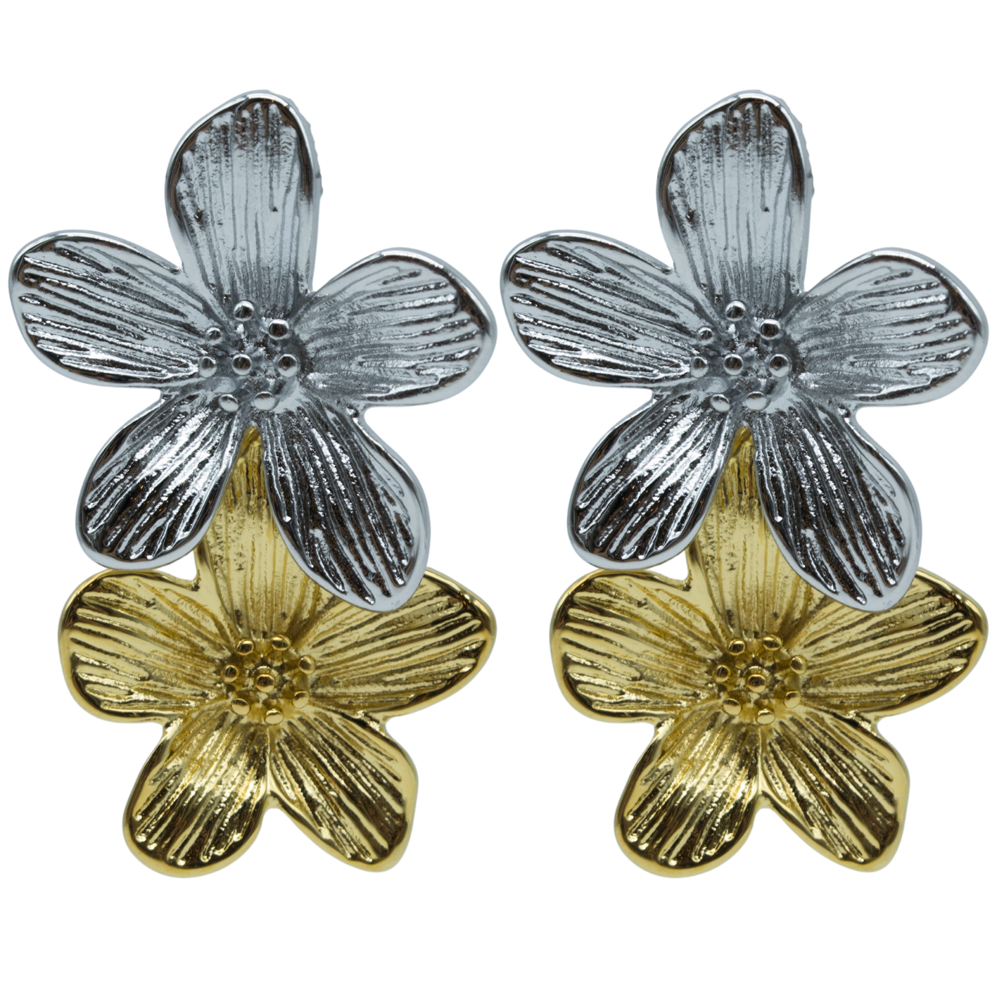 Aretes de dos flores entrelazadas con acabado texturizado que el contrastre de dorado y platado genera un contraste