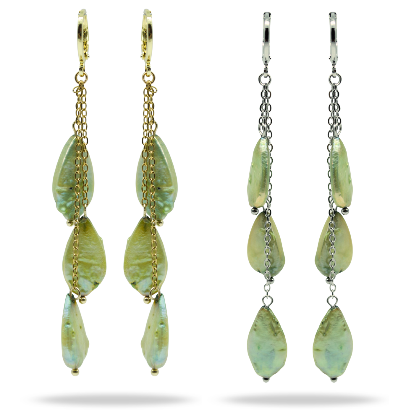 Aretes con tres piedras verdes colgados con estribo dorado de manera asimétrica