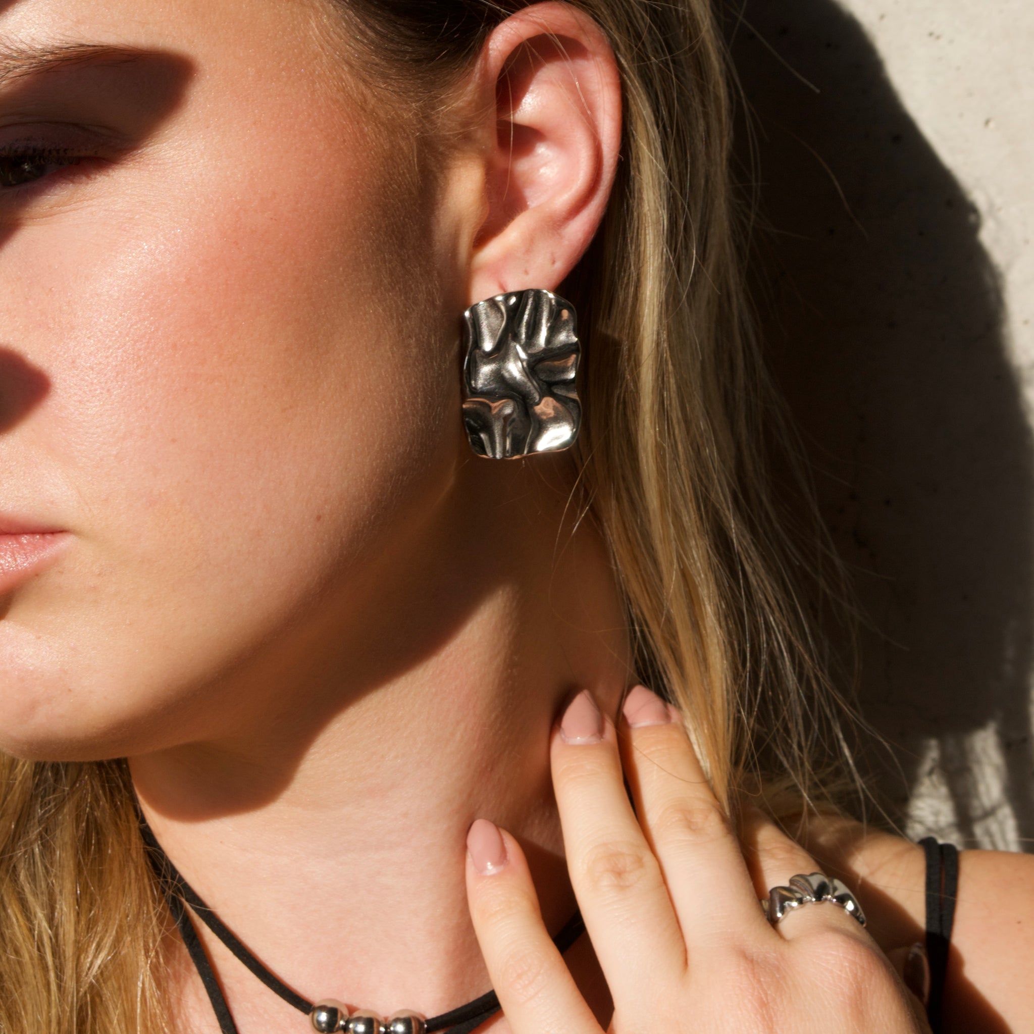 Aretes con placas con pliegues y relieves abstractos que crean reflejos únicos con cada movimiento