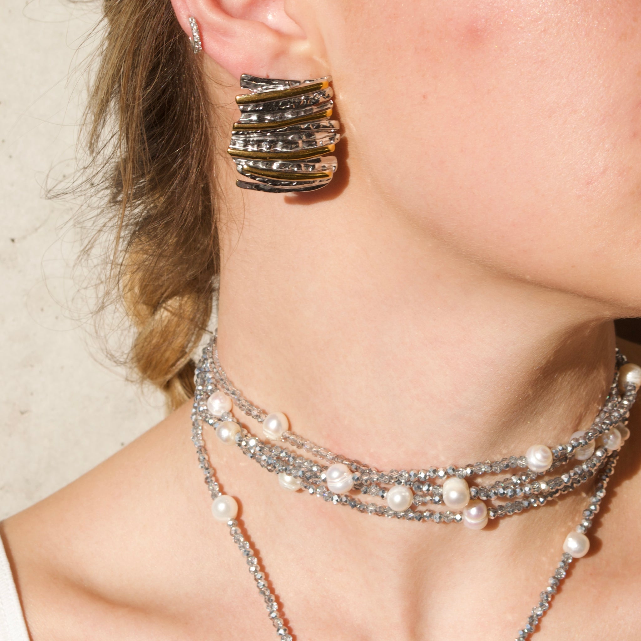 Aretes con forma rectangular de acabado texturizado. Su diseño combina dorado y plateado en franjas diagonales, creando un contraste llamativo