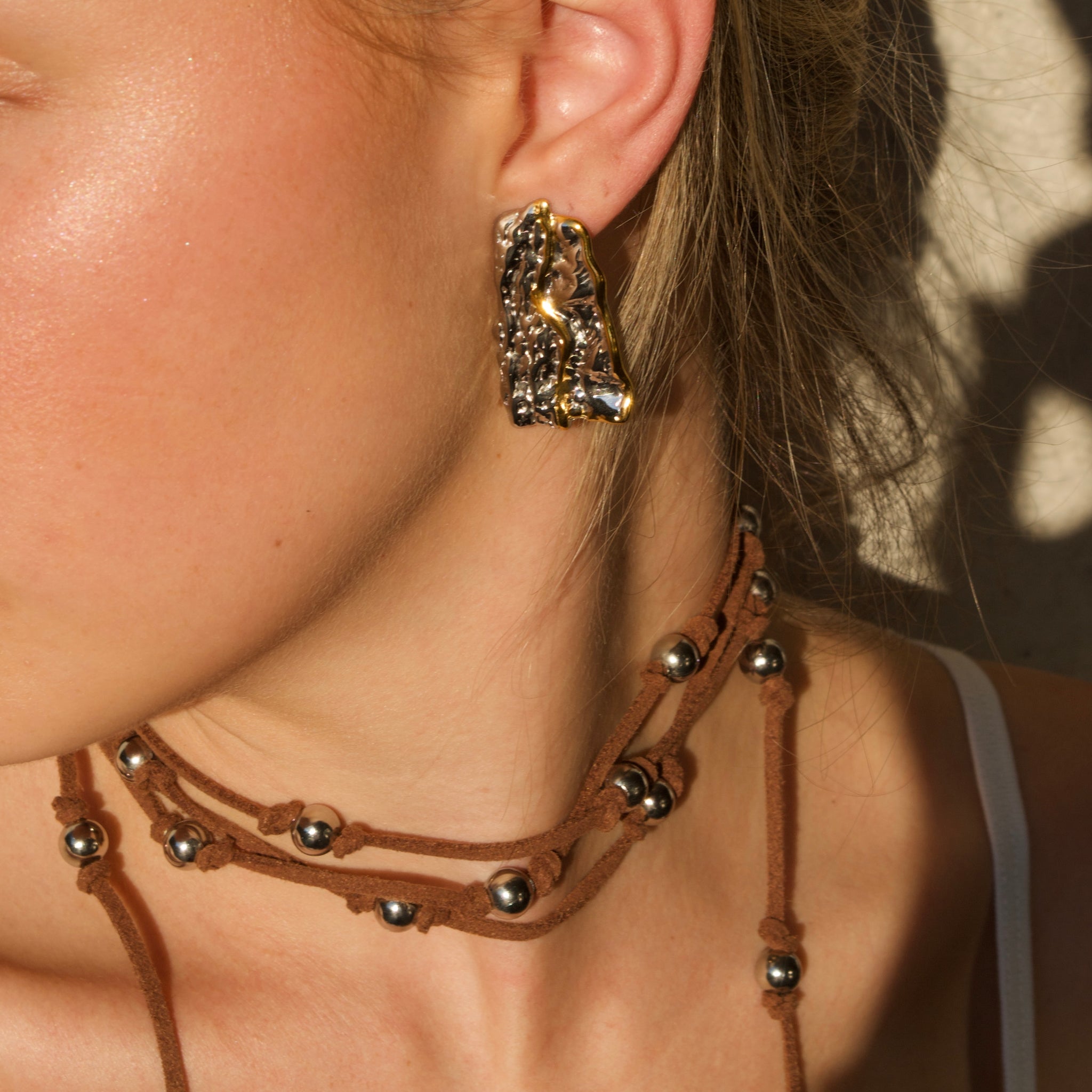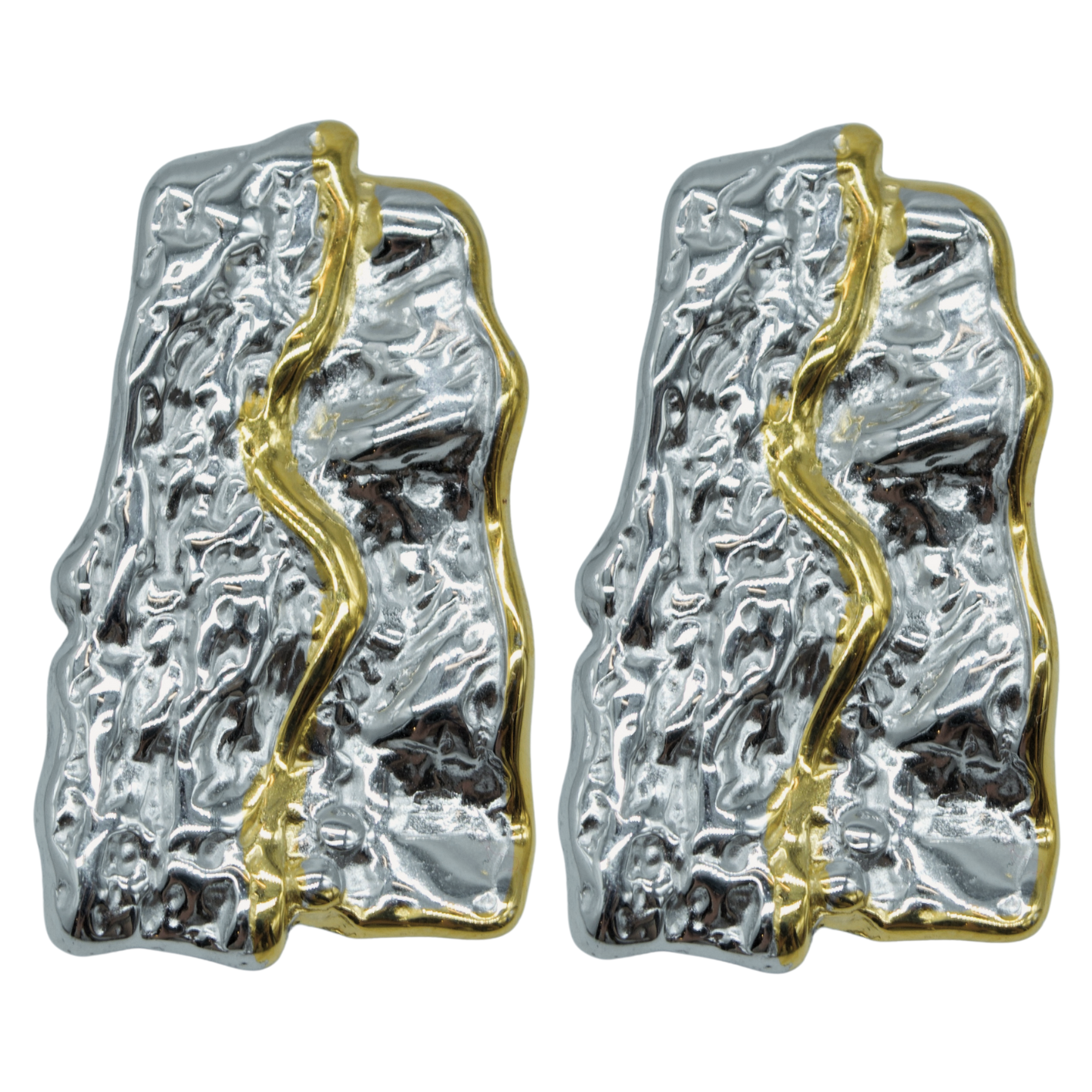 Aretes de forma rectangular con acabado rugoso en plateado y un detalle en línea dorada al centro