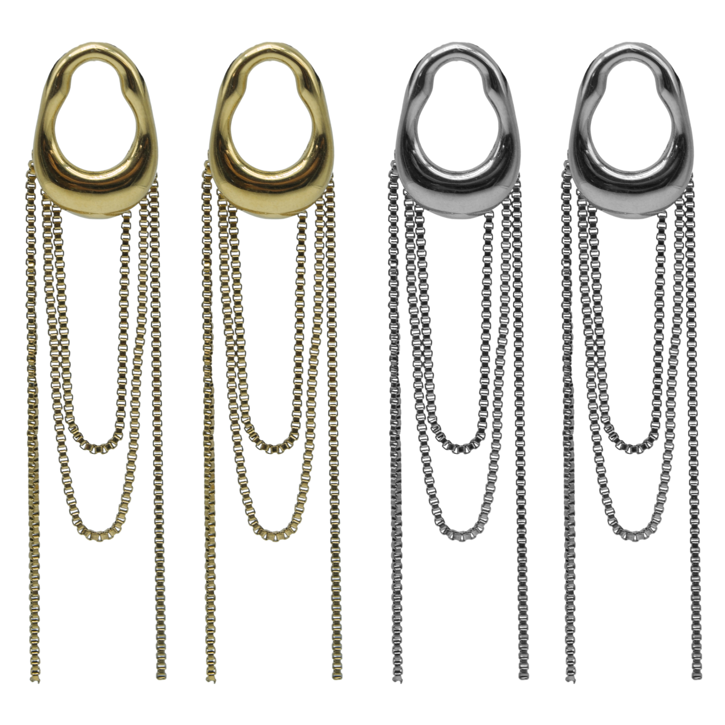 Aretes largos con diseño orgánico en la parte superior y caídas de cadenas que aportan movimiento y versatilidad