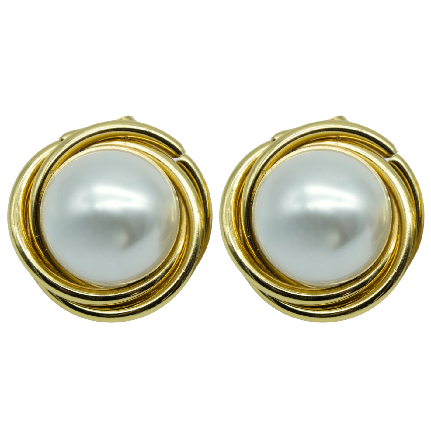 Aretes de botón con un aro en espiral dorado que enmarca una perla blanca, creando un contraste clásico. Su forma redonda y elegante los convierte en una pieza atemporal