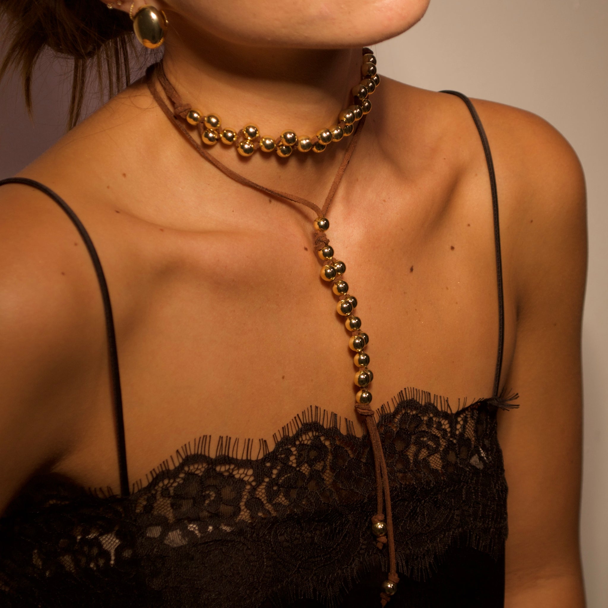 Set de collares de gamuza con piedras. Incluye una gargantilla tipo choker que ajusta con tiras en la parte trasera, creando un detalle elegante que cae sobre la espalda, y un collar largo con caída frontal de bolitas que también se regula con nudos traseros. Juntos forman una combinación sofisticada que resalta tanto por el diseño al frente como por el acabado en la parte trasera