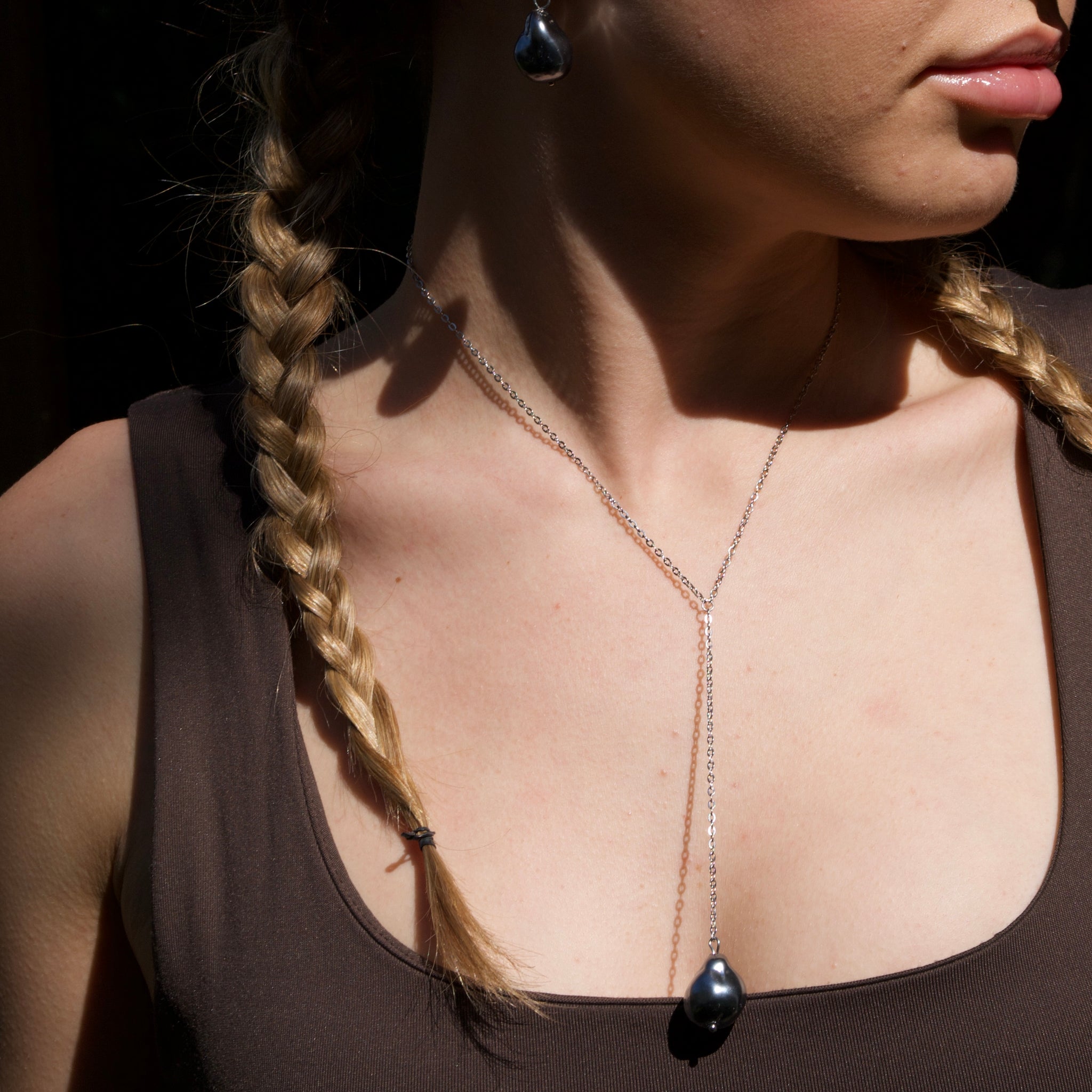 Collar tipo “Y” con una caída sencilla que termina en una perla azul, lo que lo convierte en un look elegante y minimalista