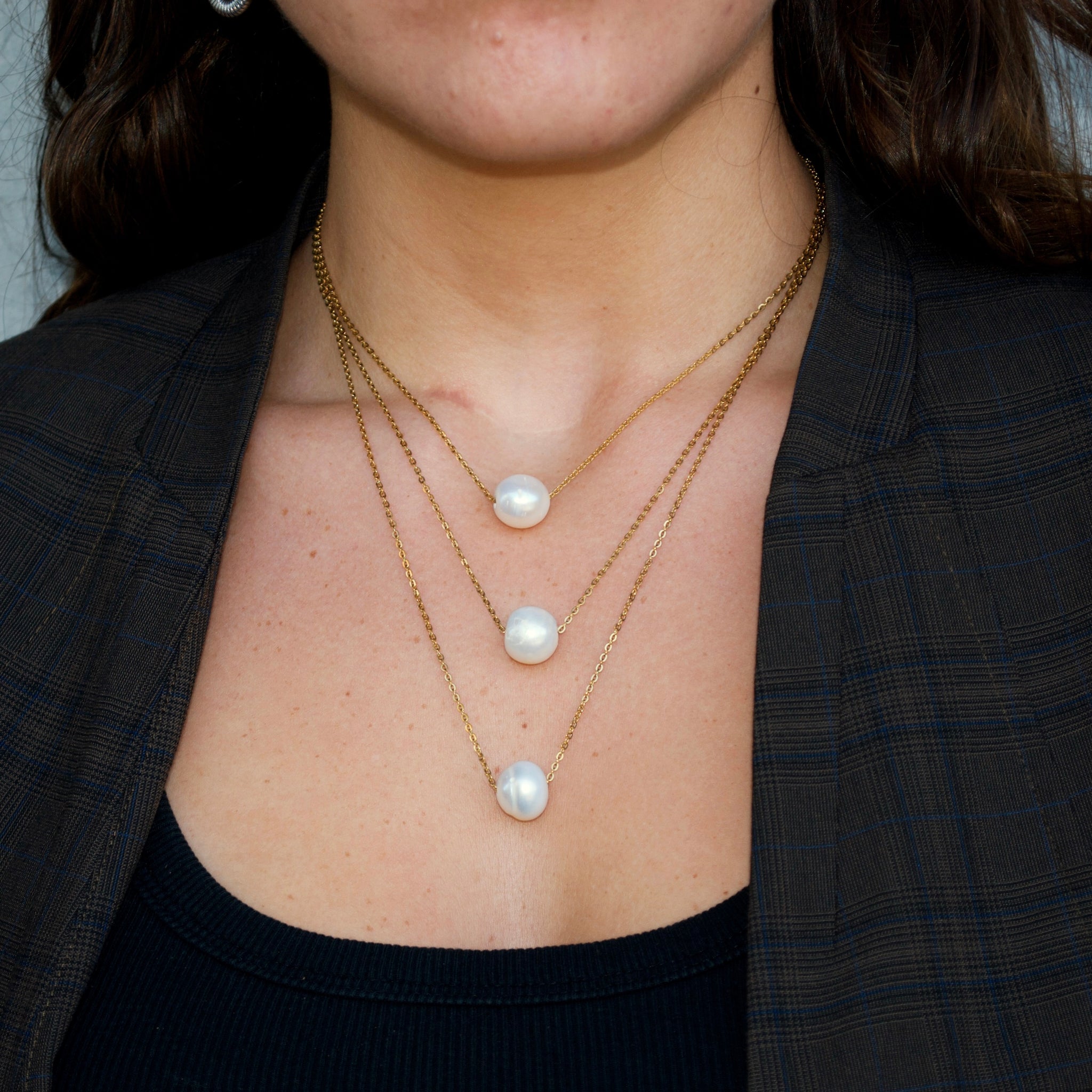 Collar de tres caídas en diferentes largos, cada una con una perla central que aporta equilibrio y elegancia al diseño