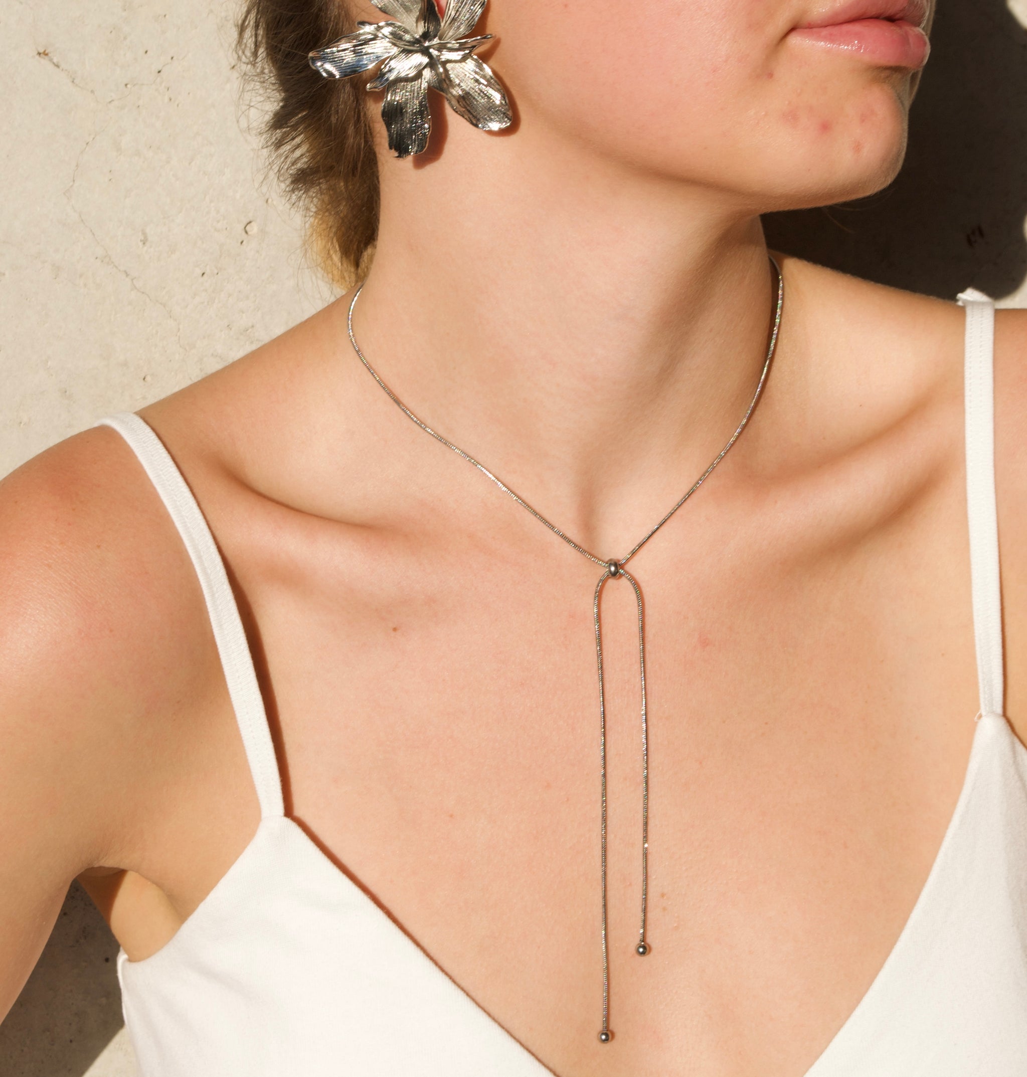 Collar tipo corbata con diseño cruzado en el centro, donde el agarre se forma a partir de un entrelazado. Los extremos terminan en pequeñas bolas que caen al frente, dando un estilo ligero y alargado.