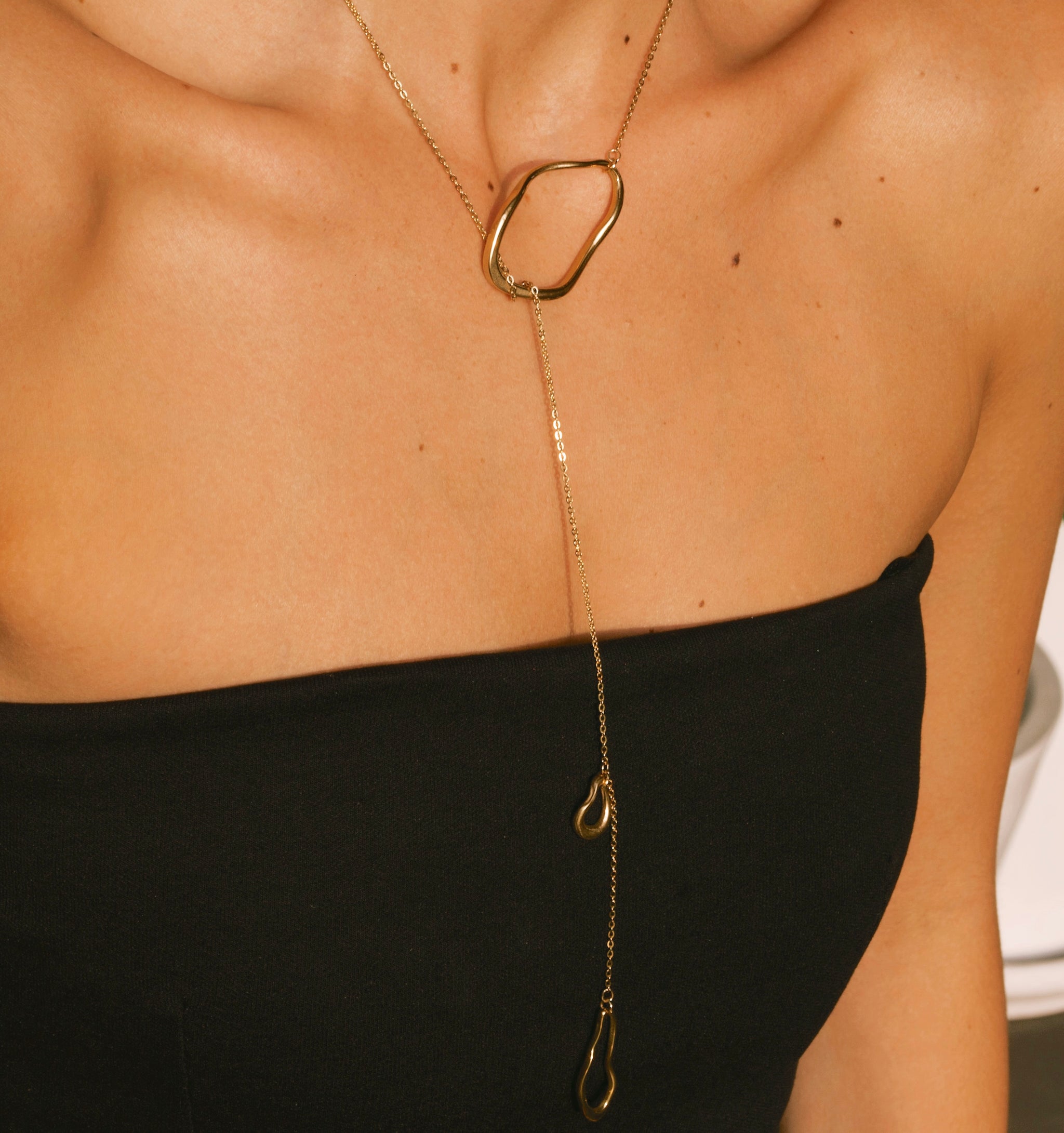 Collar de cadena larga que se entrelaza por un dije circular grande al centro, dejando caer dos dijes en tamaños mediano y chico. Su caída estilizada crea un efecto elegante y alargado