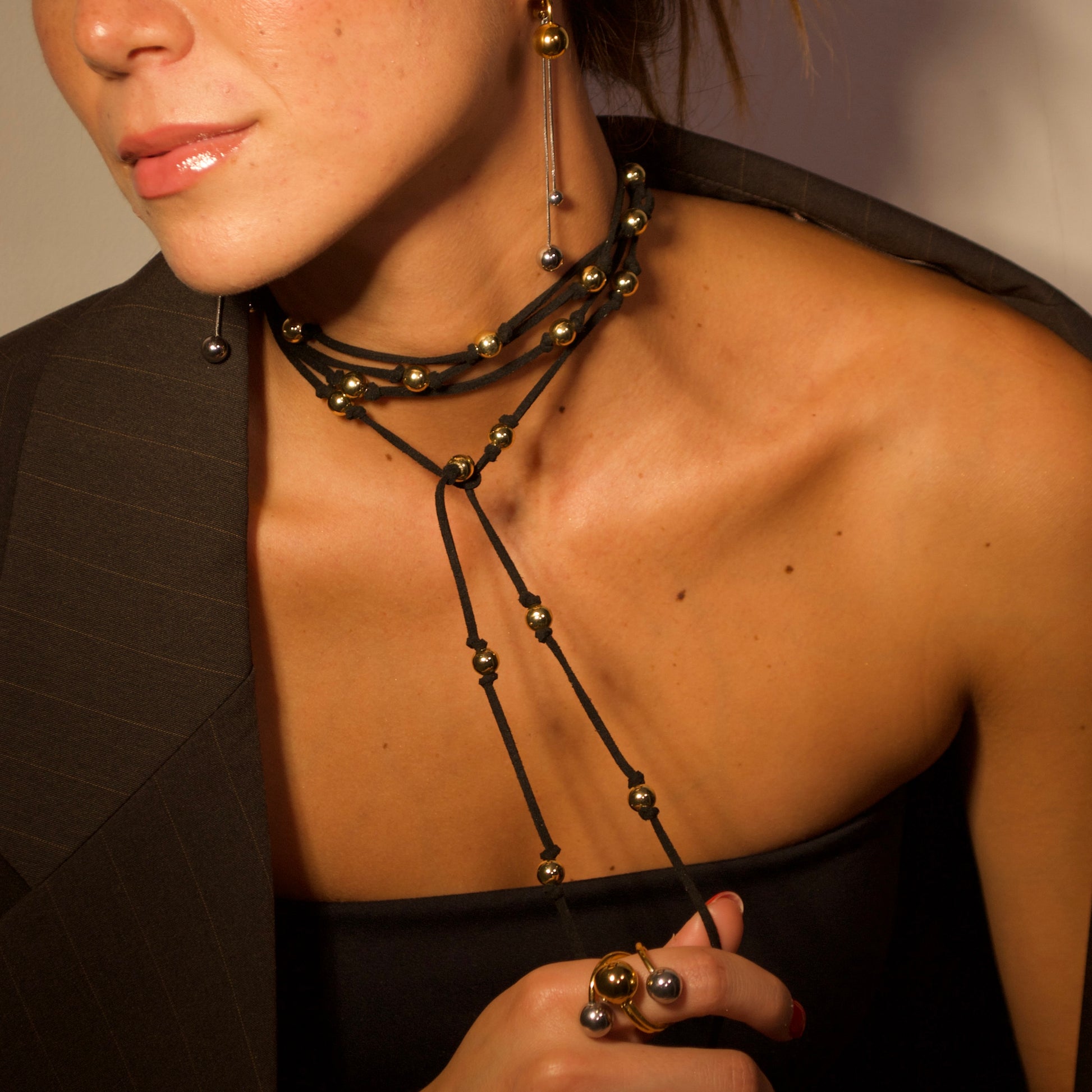 Collar hecho de gamuza con dijes de bolita de acero inoxidable. Disponible en negro, rojo, hueso, chocolate, camel y verde.