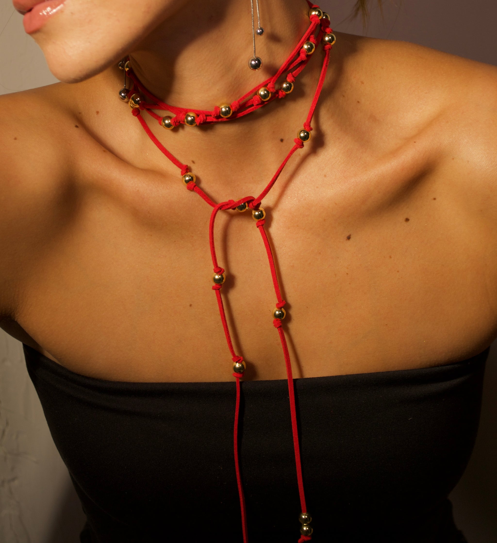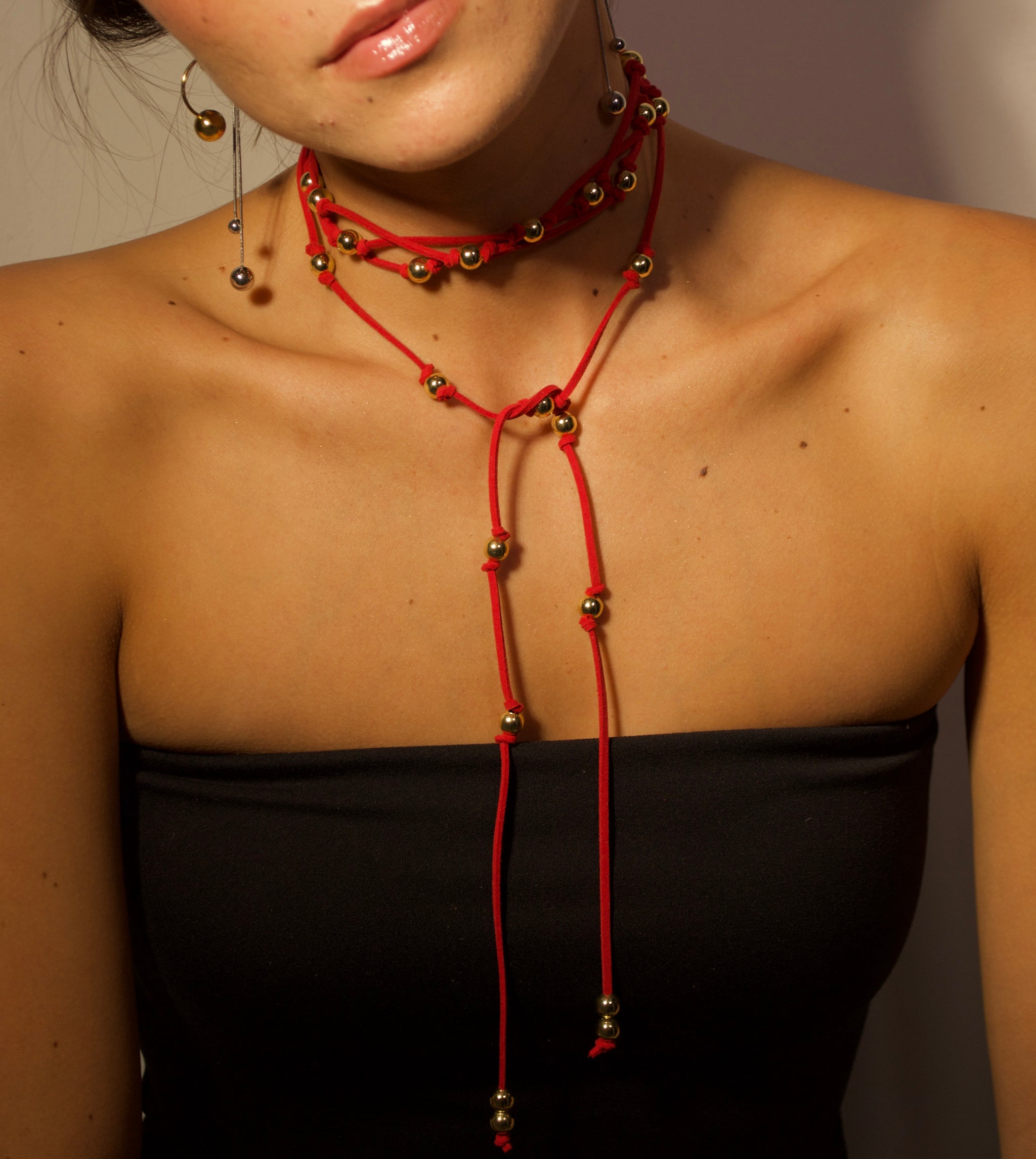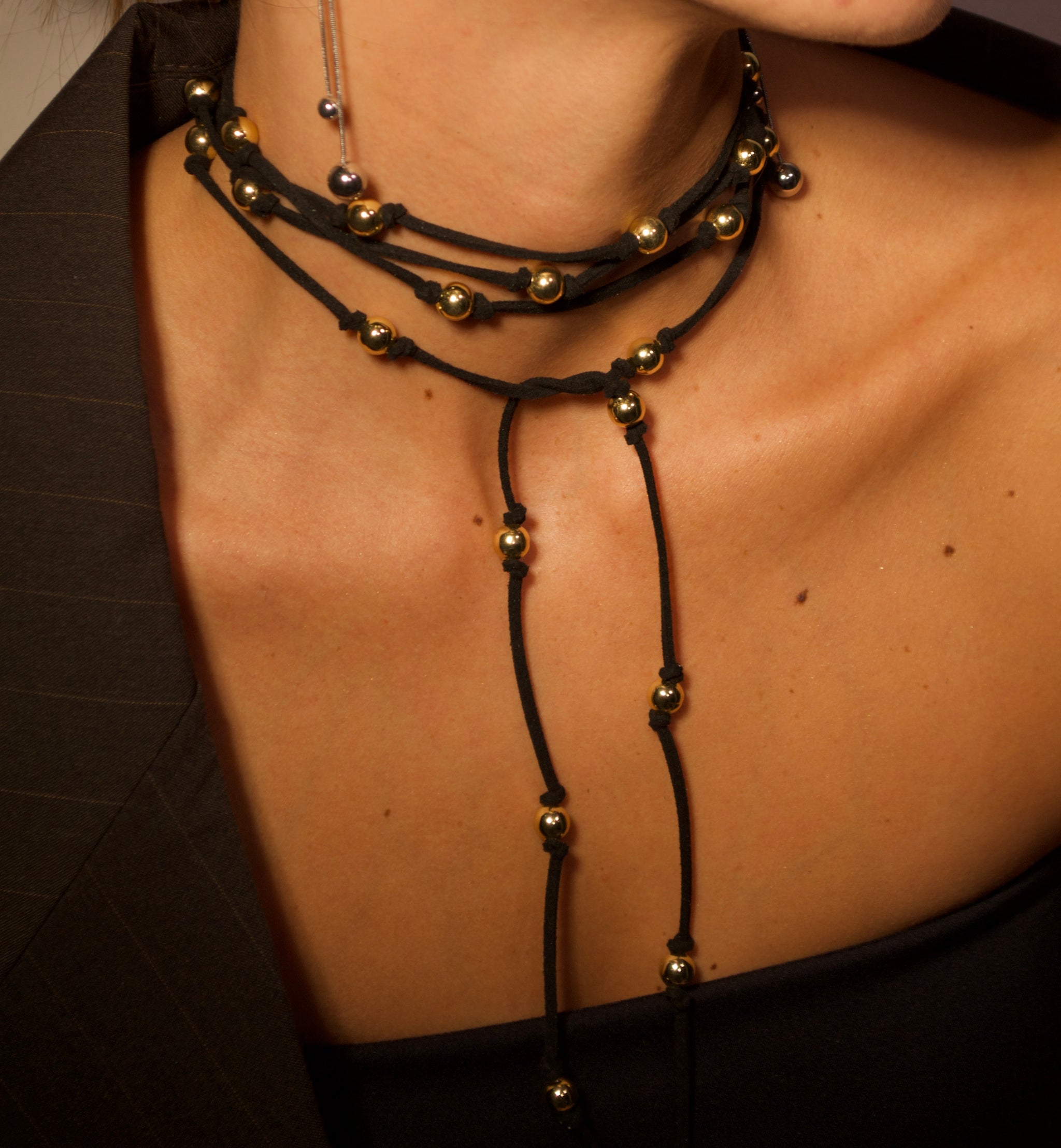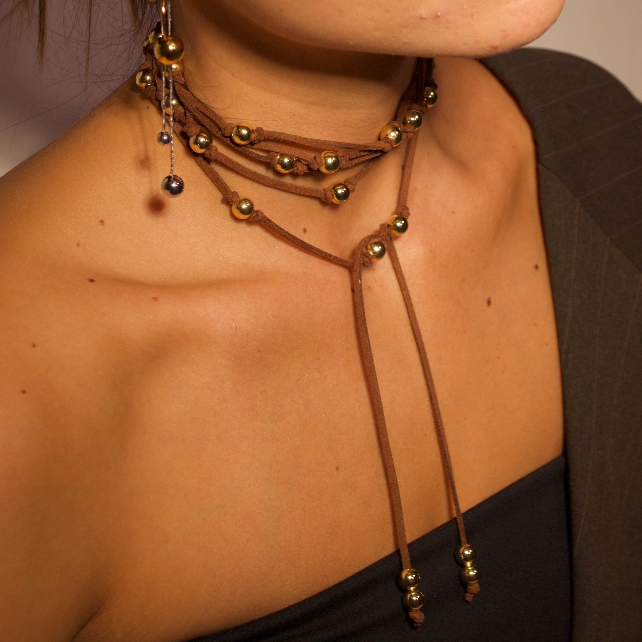Collar de gamuza con piedras distribuidas a lo largo. Su diseño versátil permite llevarlo ajustado al cuello como choker, más suelto o incluso como cinturón, jugando con las caídas de los extremos para darle un aire moderno y llamativo