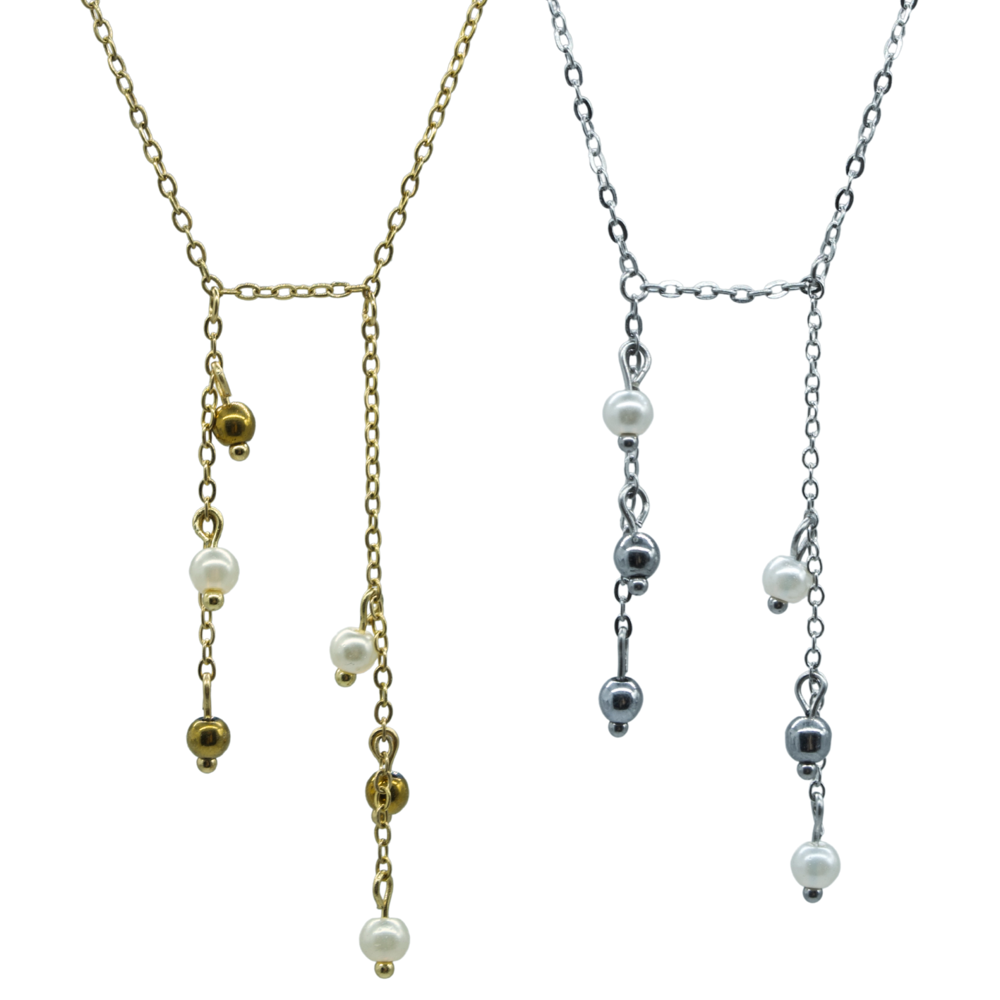 Collar con doble caída en forma de tiras, adornadas con pequeñas perlas y hematita que se alternan a lo largo de la cadena. Su diseño alargado estiliza el escote y aporta un movimiento elegante
