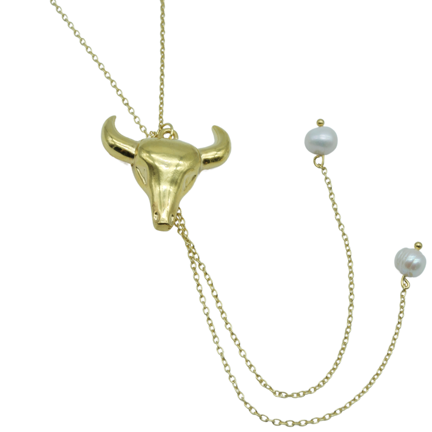 Corbata con dije central en forma de cabeza de toro, acompañado por una doble caída de cadenas que estilizan el escote. Un diseño con carácter que mezcla fuerza y elegancia en una sola pieza