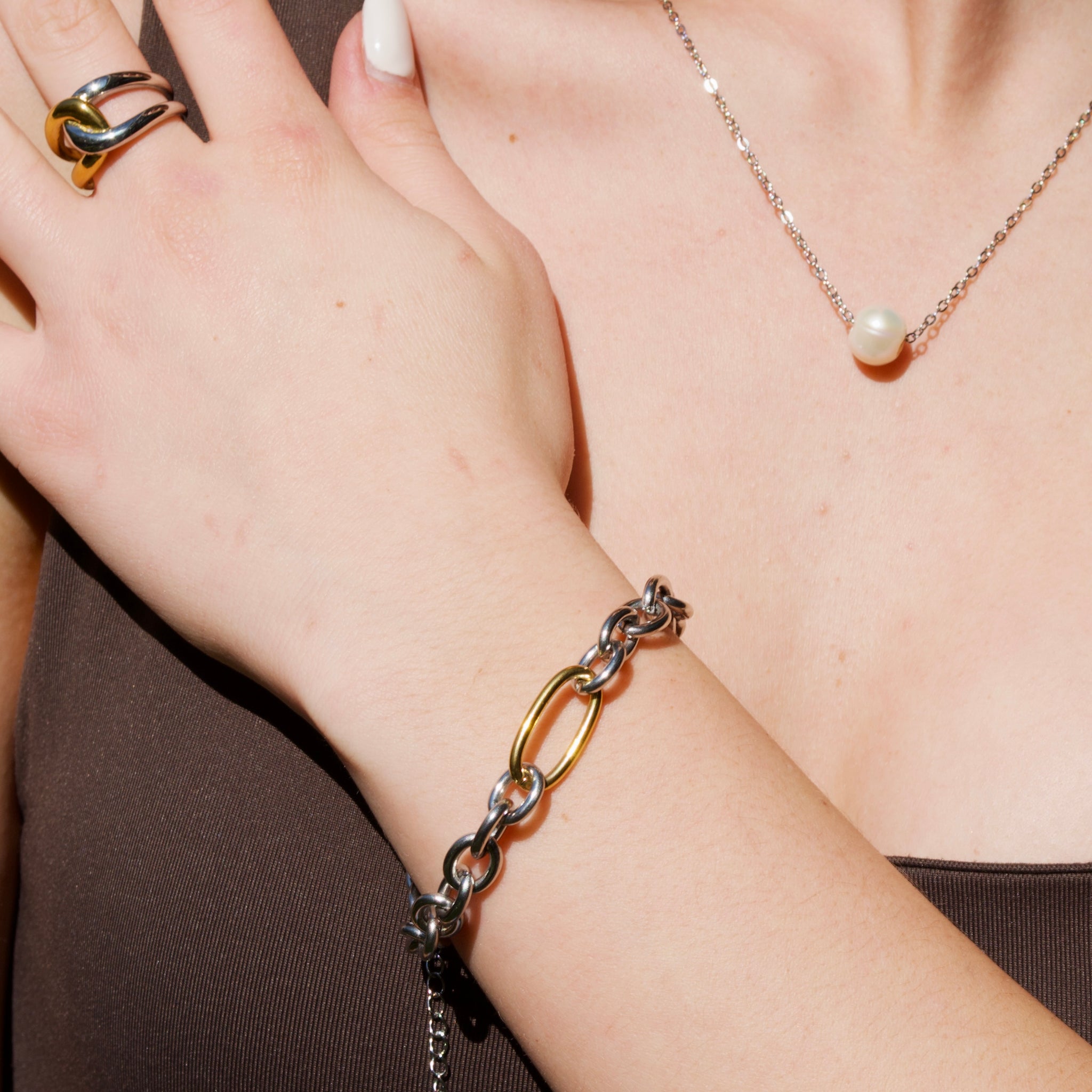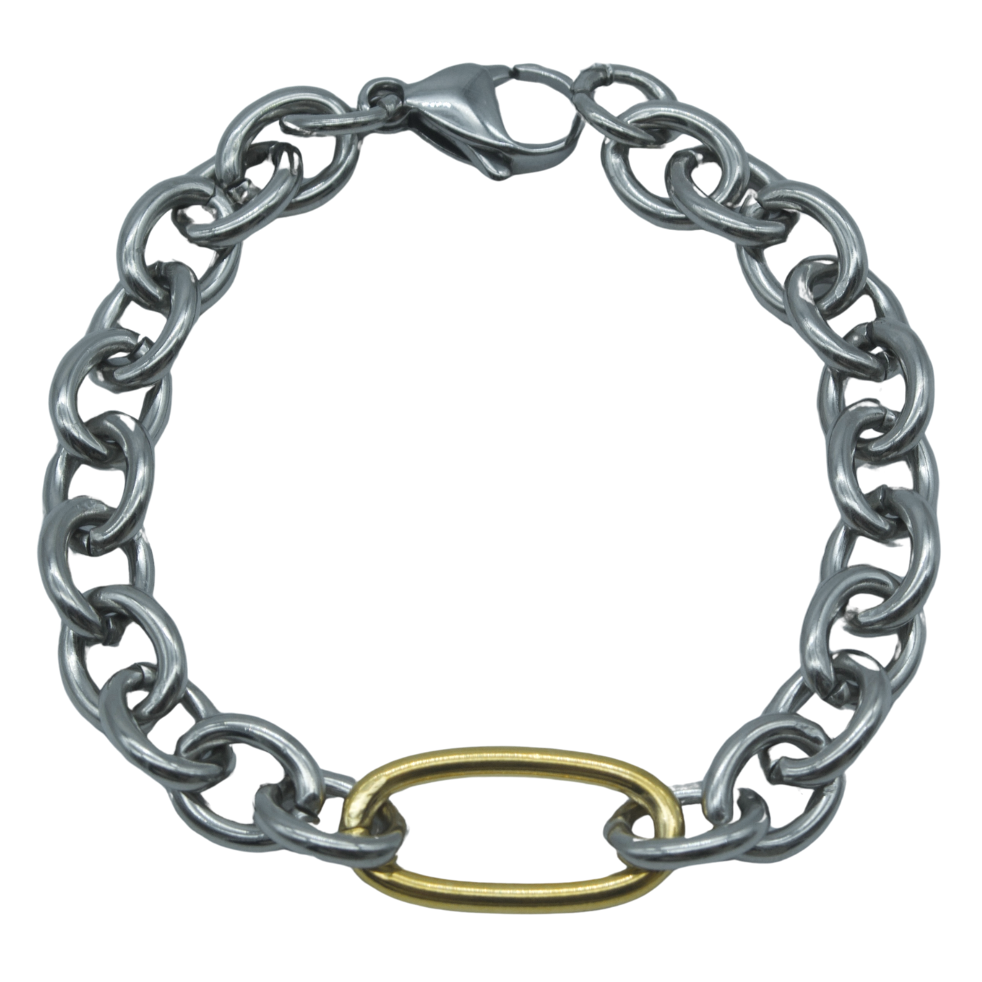 Pulsera de eslabones gruesos, diseñada con un contraste gracias a un eslabón central en acabado dorado que resalta sobre la base plateada. Su cierre asegura comodidad y resistencia