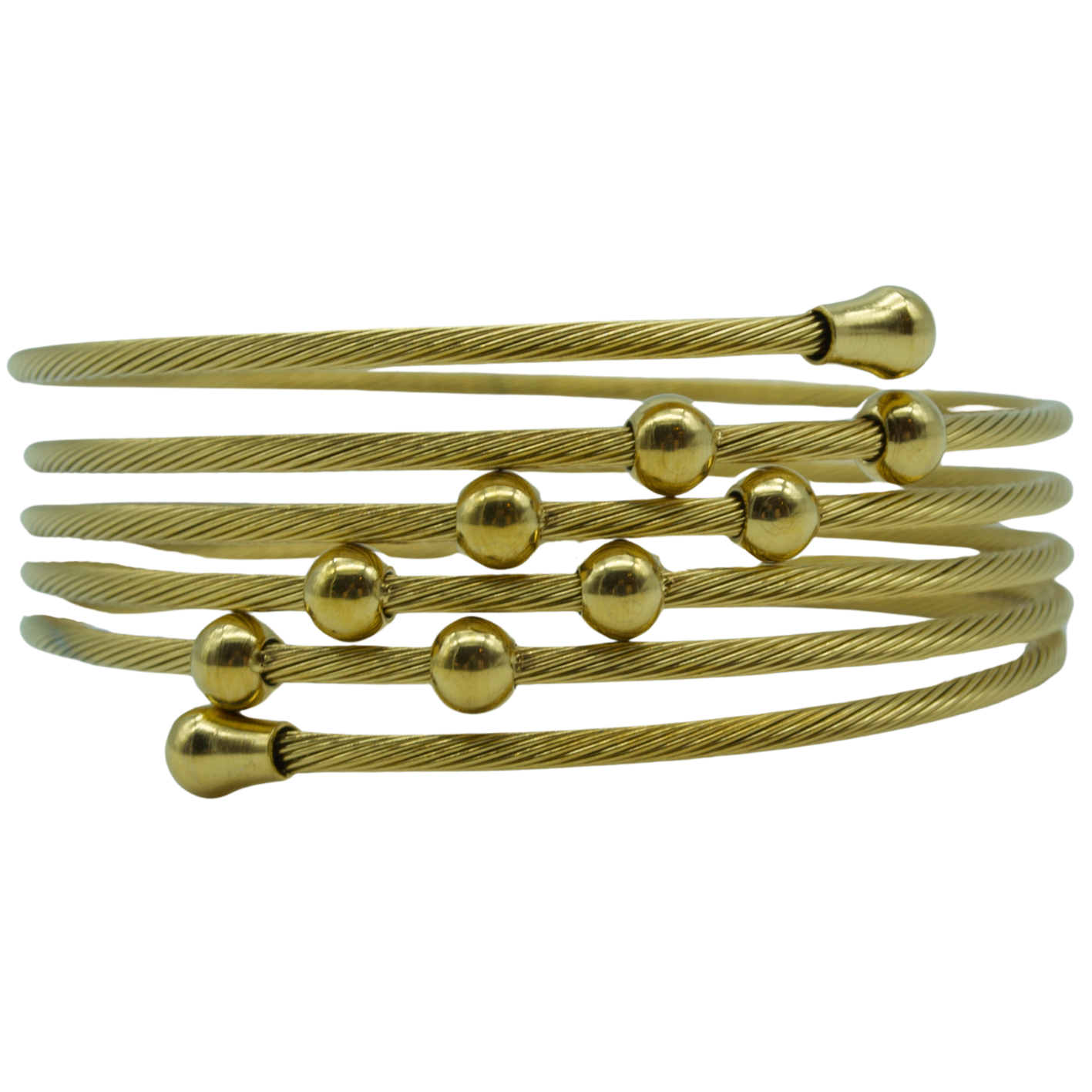 Pulsera ajustable de múltiples vueltas con diseño de cable delgado en tono dorado. Decorada con esferas metálicas doradas distribuidas a lo largo de la pieza, que aportan contraste y movimiento. Su estructura flexible permite adaptarla fácilmente a la muñeca
