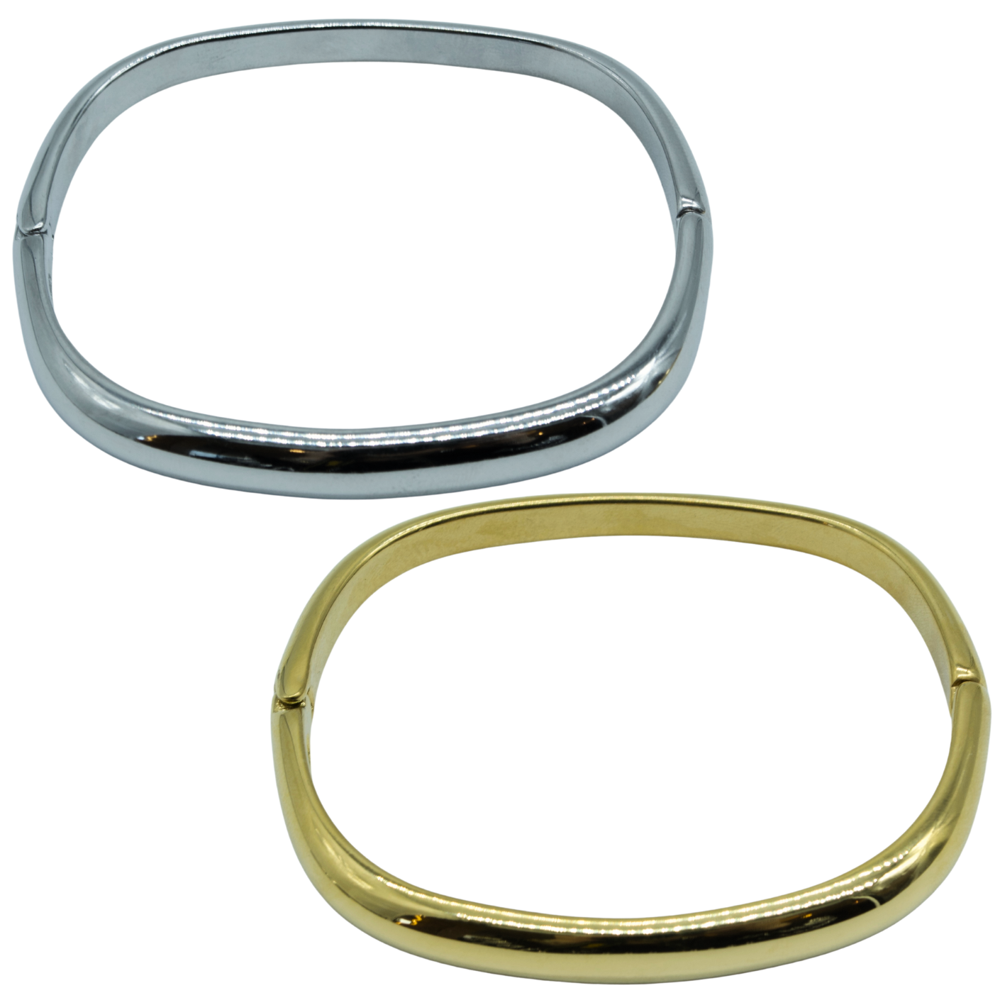Pulsera tipo esclava, rígida en forma cuadrada con bordes redondéados. Su diseño minimalista y geometrico la hace destacar como una pieza versatil. Está diseñada con un sistema de apertura: en el lado más grueso basta con presionar hacia abajo y, al mismo tiempo, abrir desde el extremo opuesto