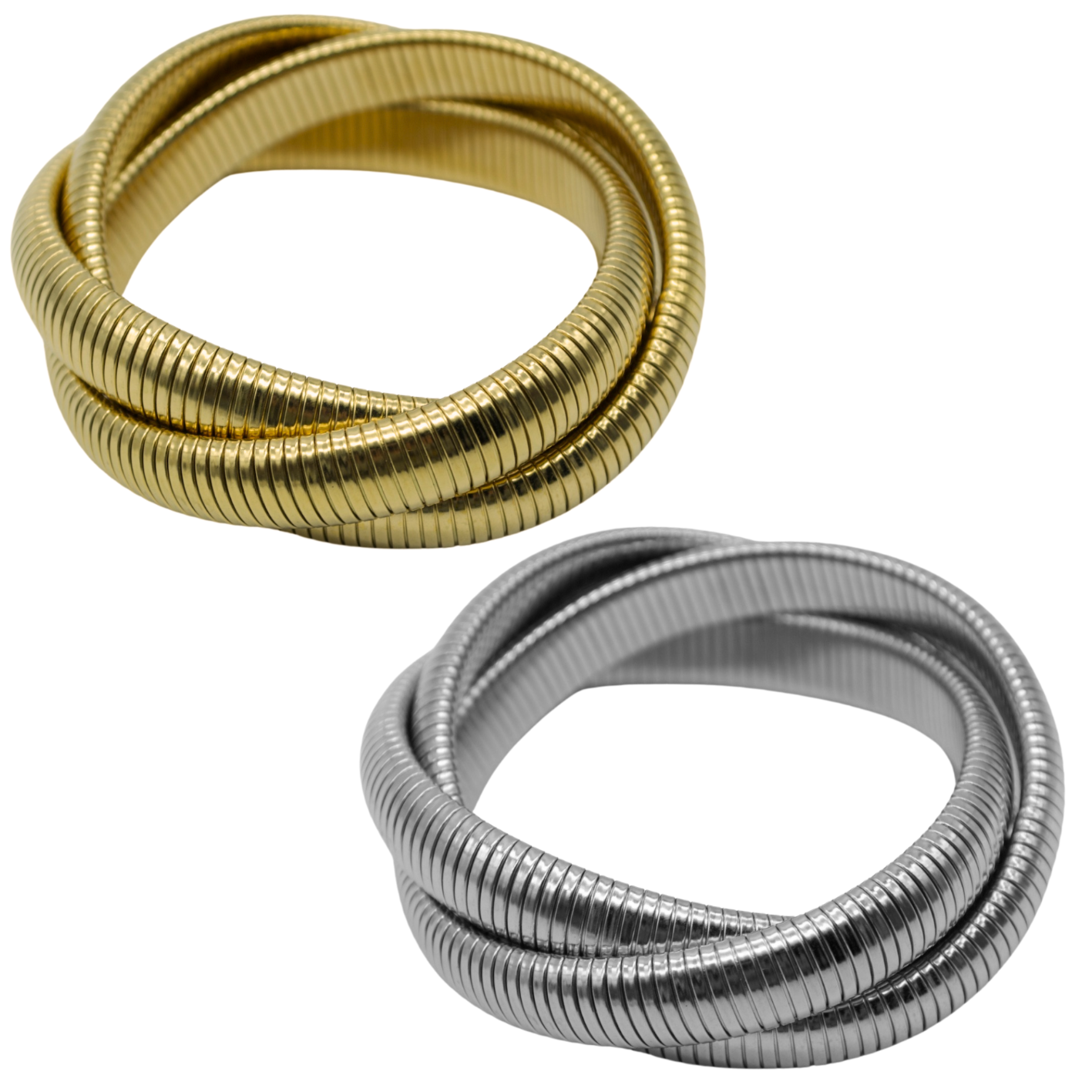 Pulsera formada por tres aros entrelazados, que se ajustan de manera envolvente a la muñeca. Su diseño doble crea un efecto visual llamativo y dinámico, con movimiento y volumen en cada giro. Esta pieza puede usarse sola como protagonista o acompañada de otras pulseras para un estilo más cargado